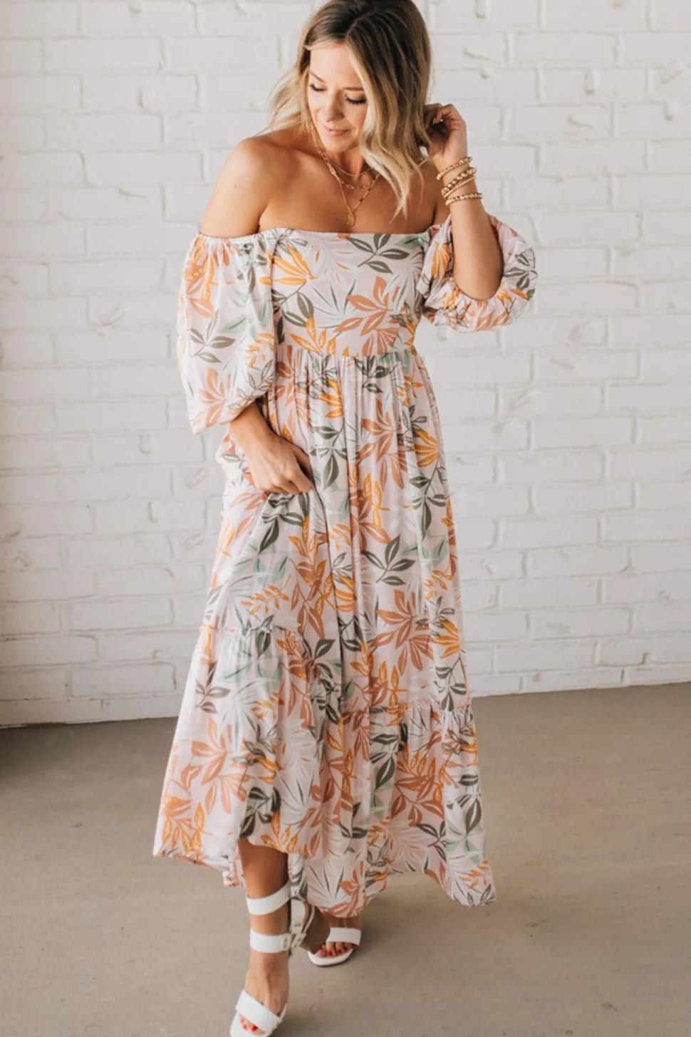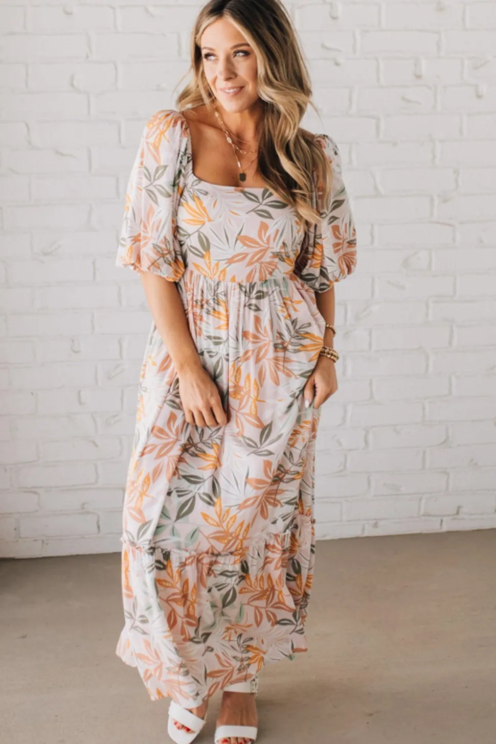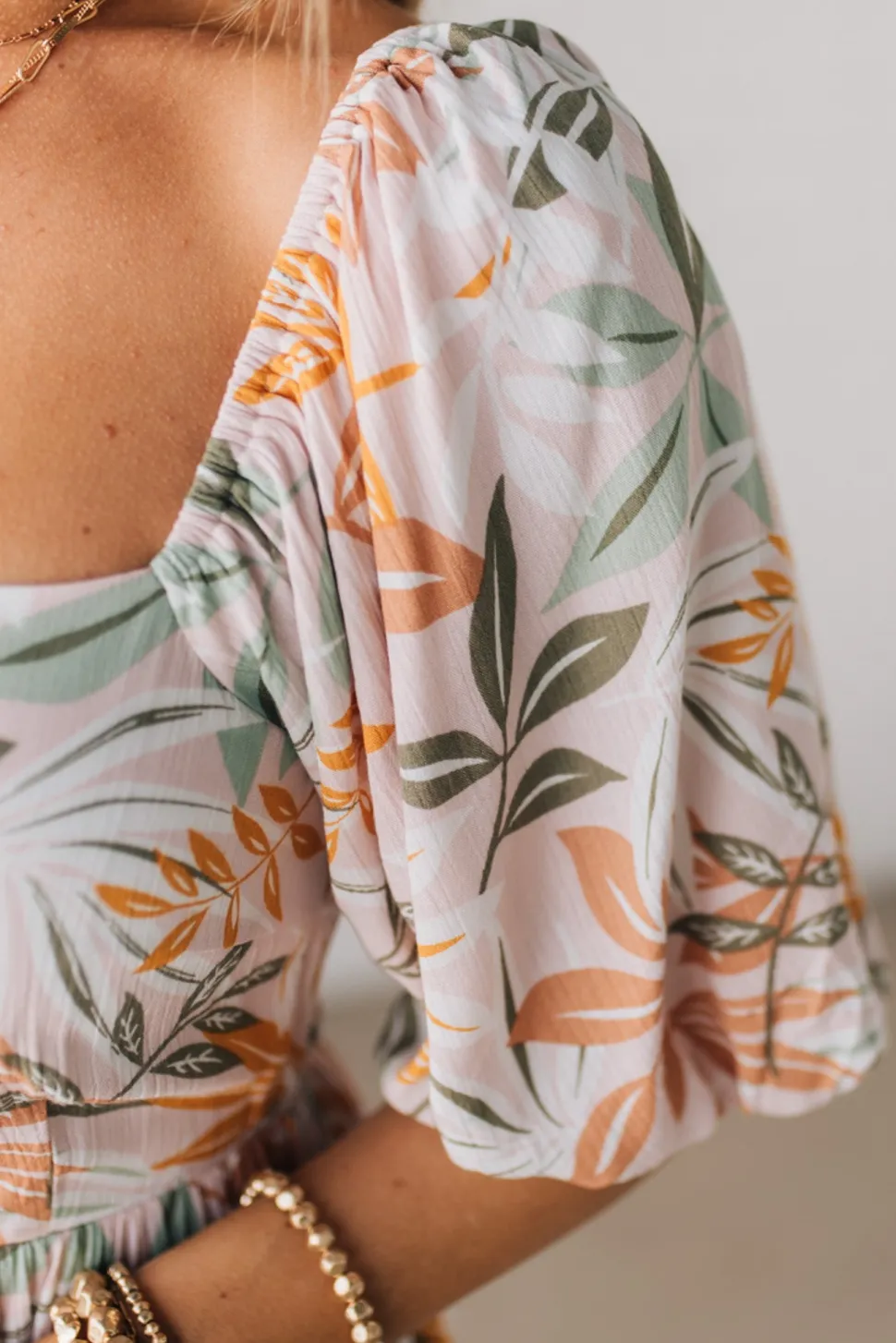 Pretty shades of orange and pink flowers that we are dead over! This pretty dress has a fitted bodice, with a pretty square neckline! The half, puffed sleeves pillow perfectly and stay right in place with the hidden elastic band.
