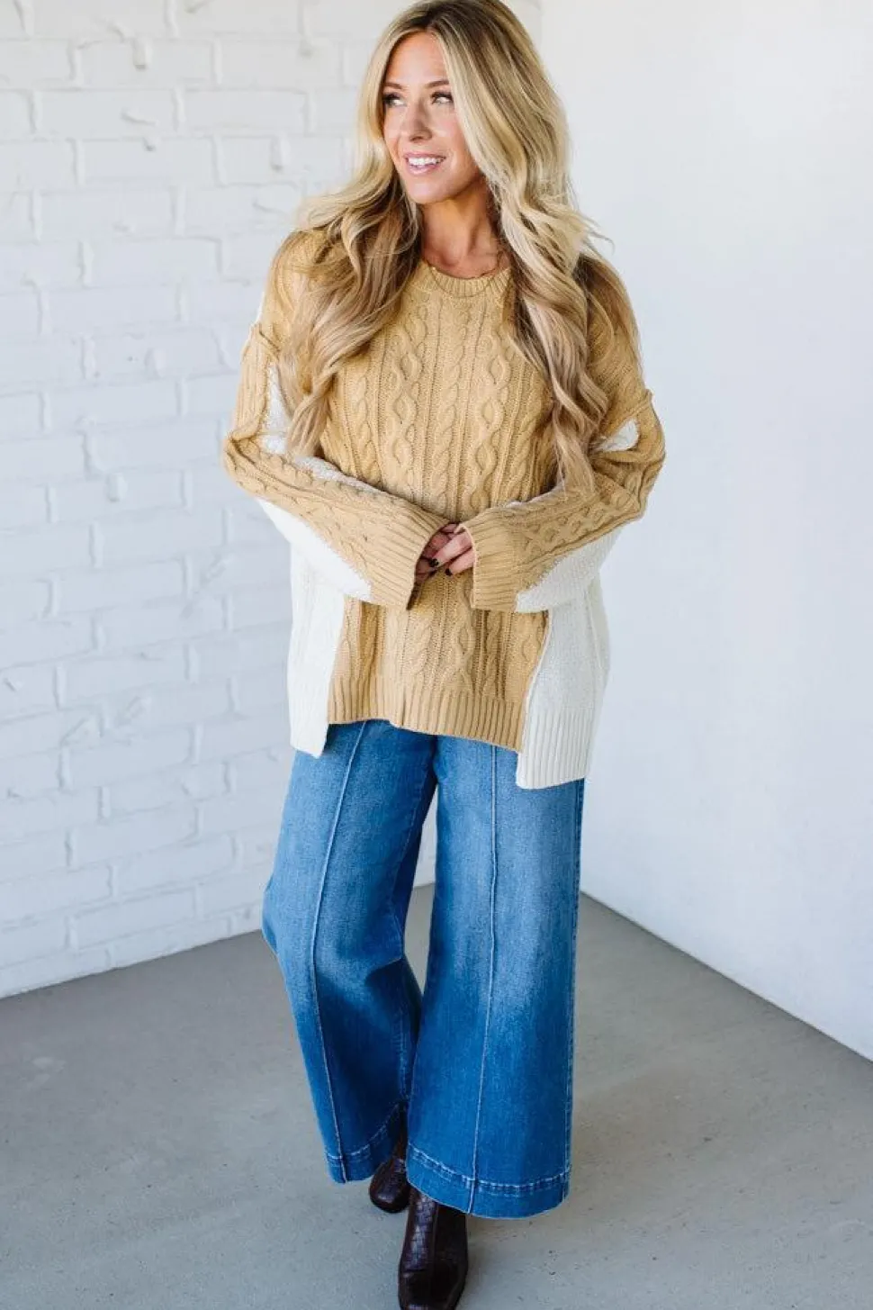 Perfect for busy women who want comfort and style without sacrificing warmth during unpredictable fall weather. The Cream Pie Cable Knit Sweater combines classic cable knit texture with a modern two-tone design, offering cozy coverage that feels intentional and polished, not frumpy.