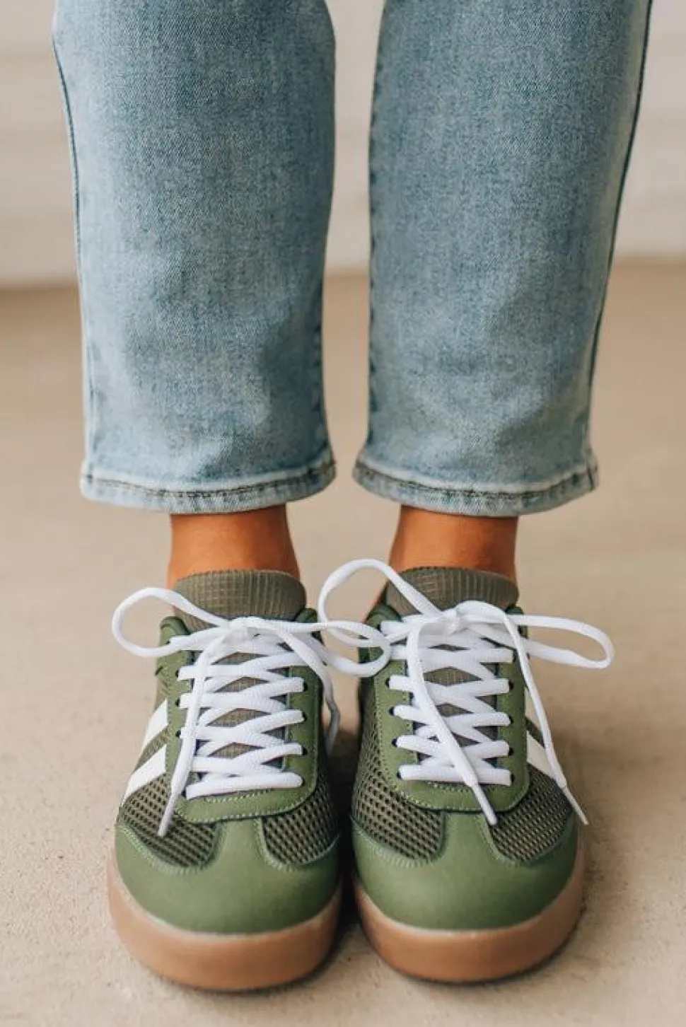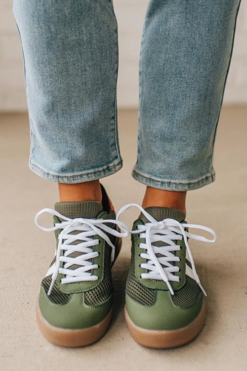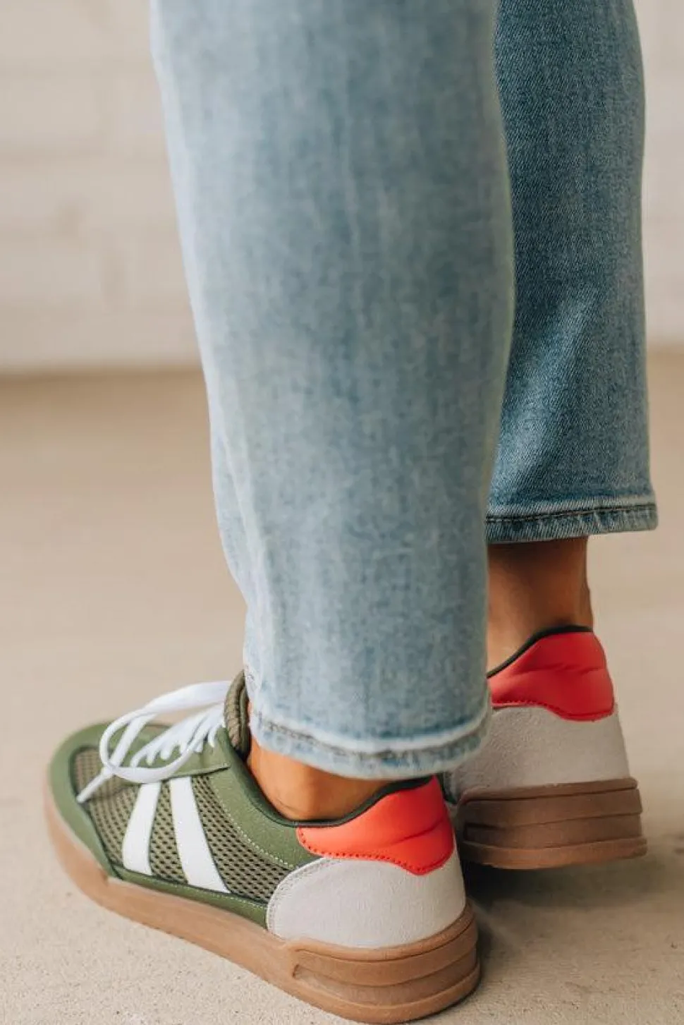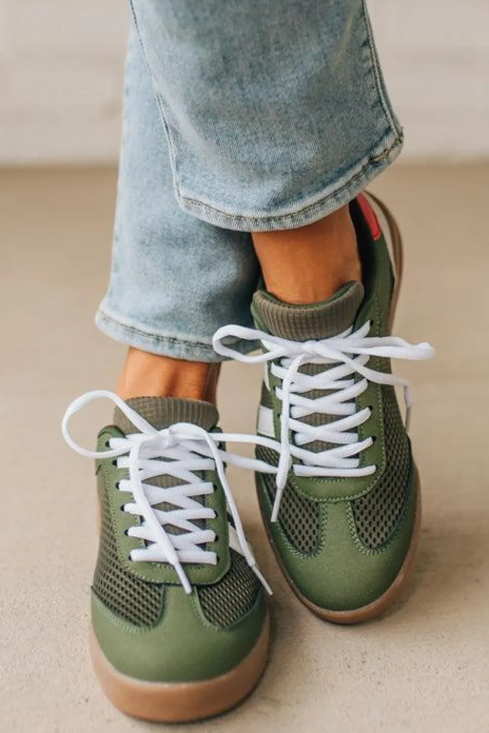 - All-over olive color with white laces keeps the shoe versatile – wear them with neutral capsule pieces or let the red accent add a subtle pop.