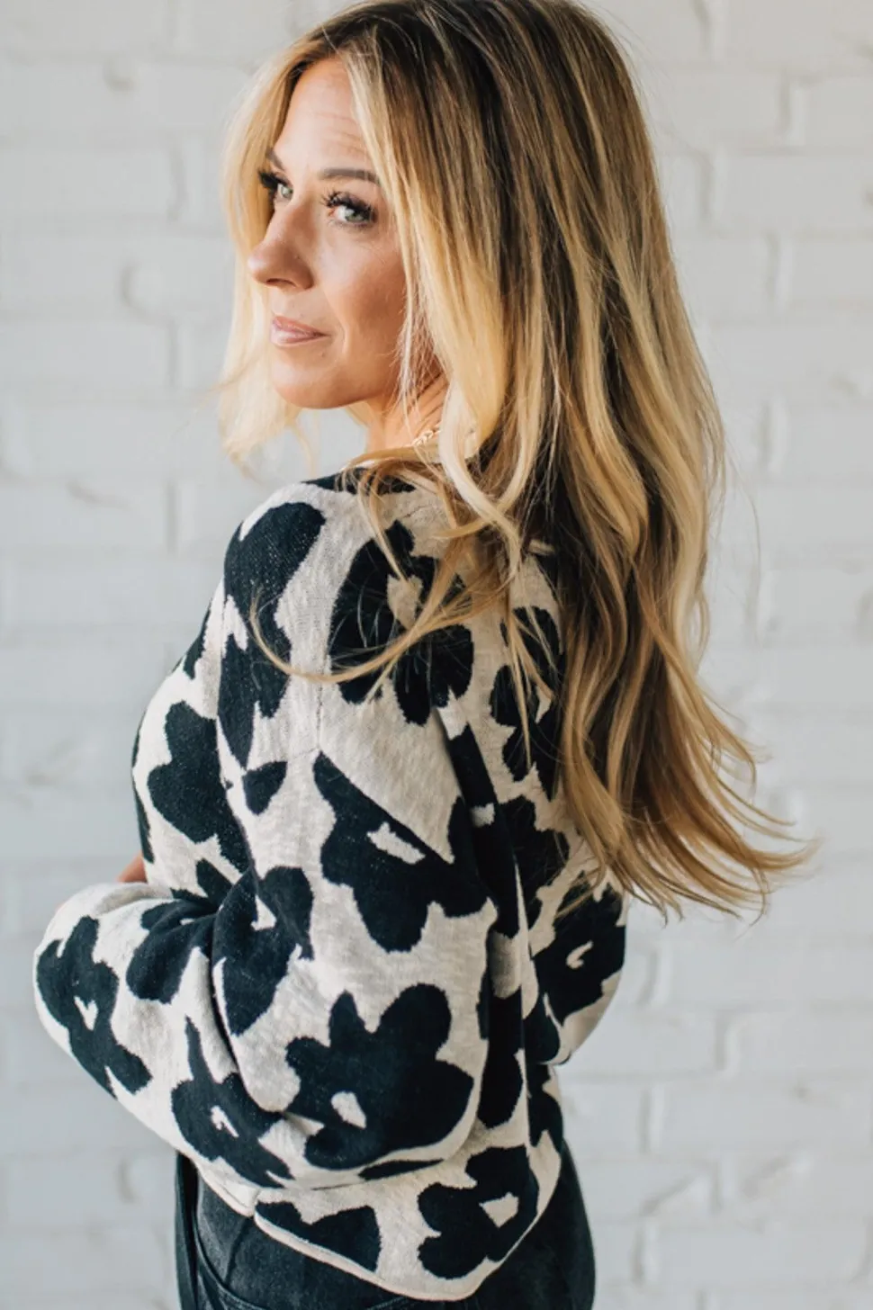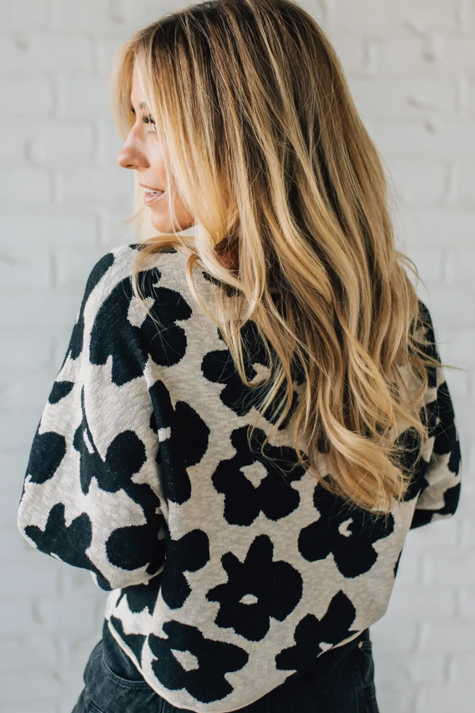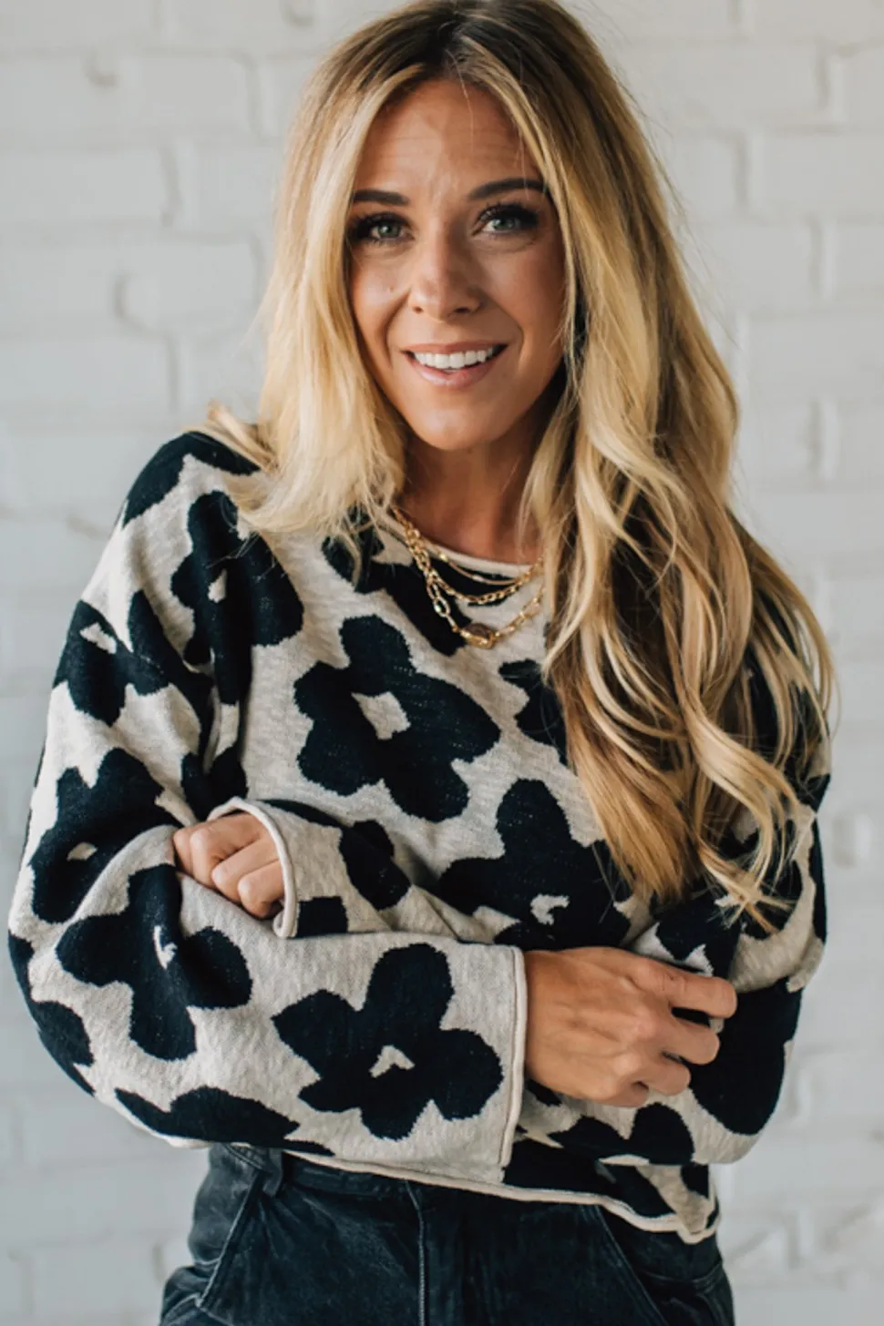 - Loose fit flower lightweight sweater top, featuring a bold cream background with a black oversized daisy weave – makes a statement without screaming for attention.
