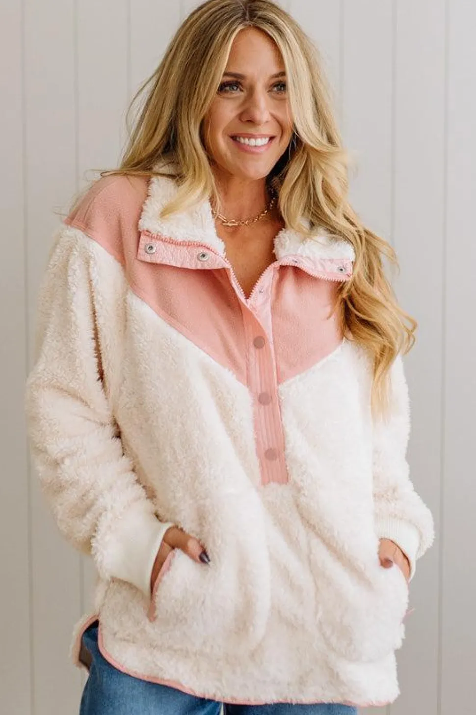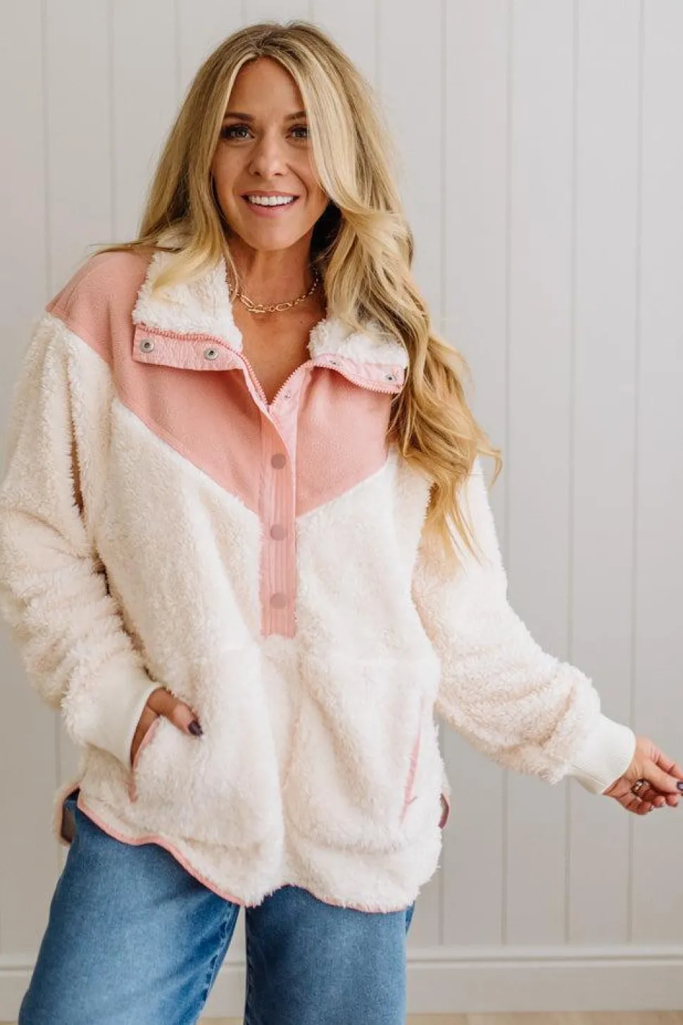Ready to upgrade your cozy wardrobe? Add the Blocked Sherpa Pullover to your collection for effortless warmth and style that works from morning coffee runs to evening gatherings. Shop now at our boutique.