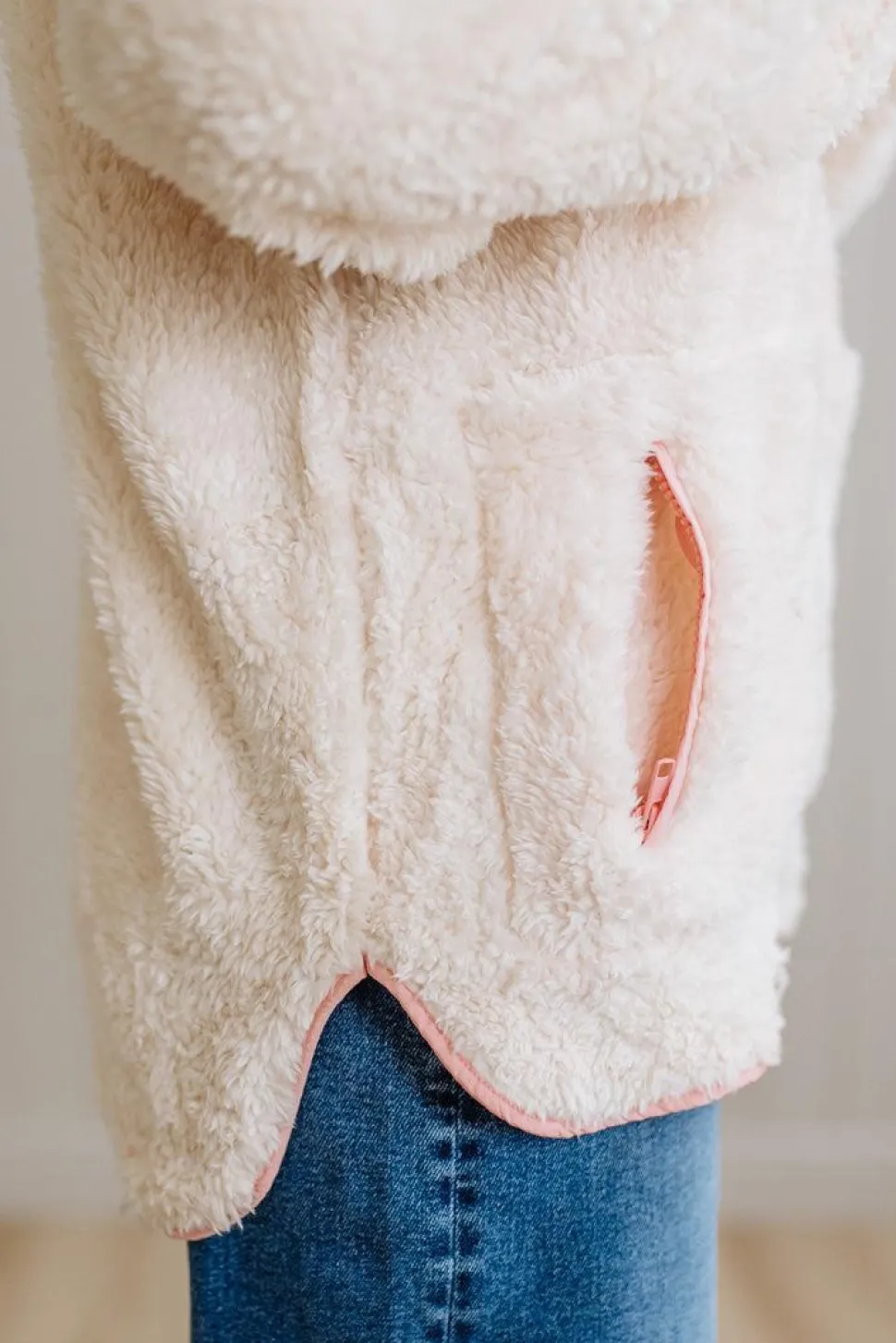 • Fabric: Super comfy sherpa fleece with contrast fabric yoke, partial front zip closure with button closure detail, long sleeves with ribbed cuffs, dropped shoulders, and front kangaroo pockets – machine wash warm and hang to dry for best care