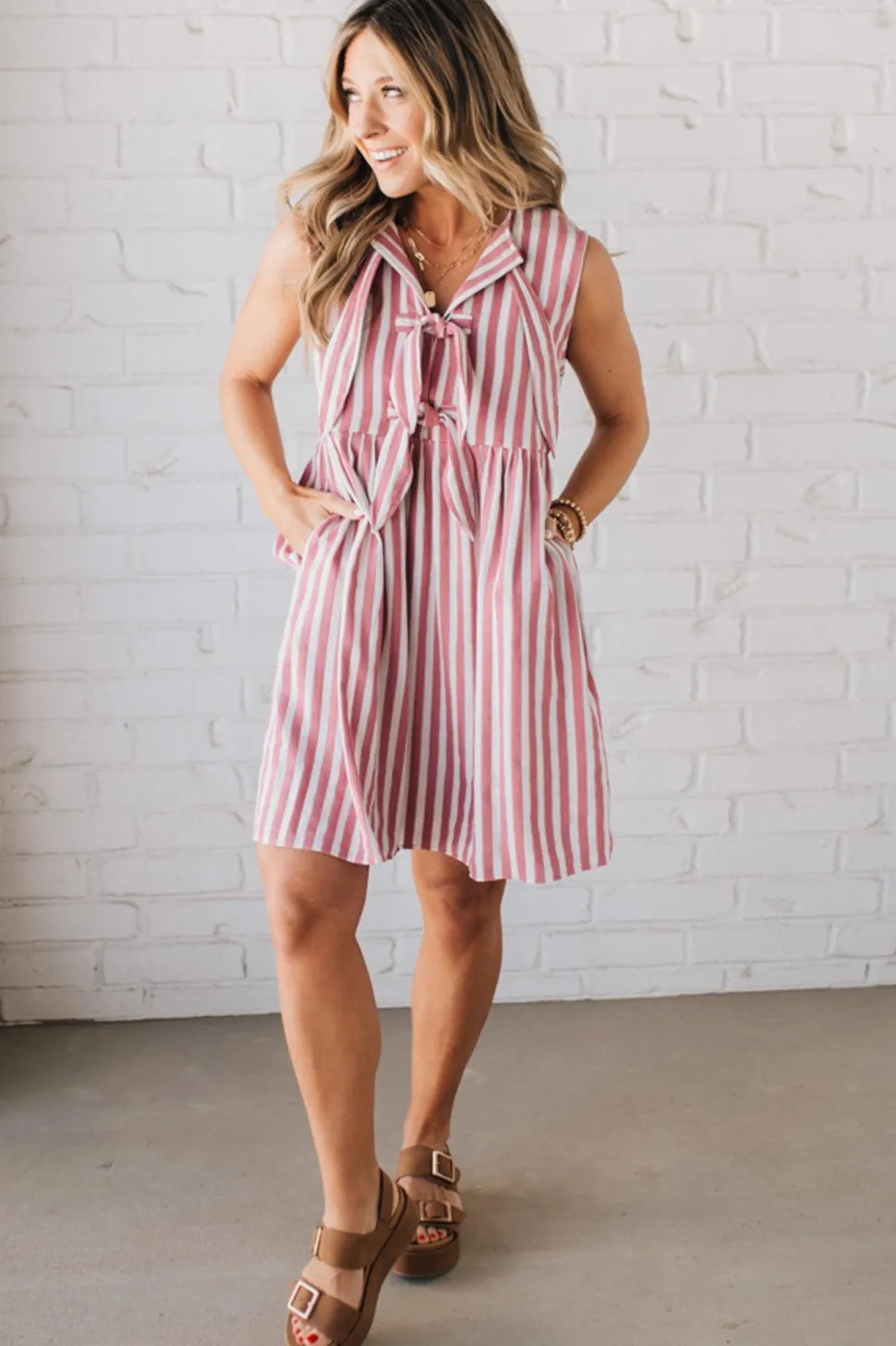 Get ready to make a statement in our Bradie mini dress! Featuring bold vertical stripes and a playful triple front bow detail, this dress is perfect for standing out in a crowd. With its unique design and eye-catching style, you’ll be the center of attention wherever you go.