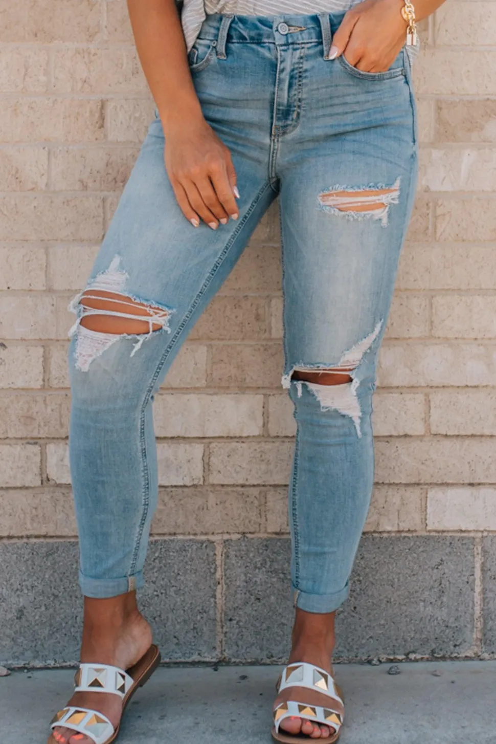 Easy, breezy distressed skinnies with the most comfortable fit, a mid rise and perfect amount of stretch. We love these light wash skinny jeans for a casual day at home or out and about!