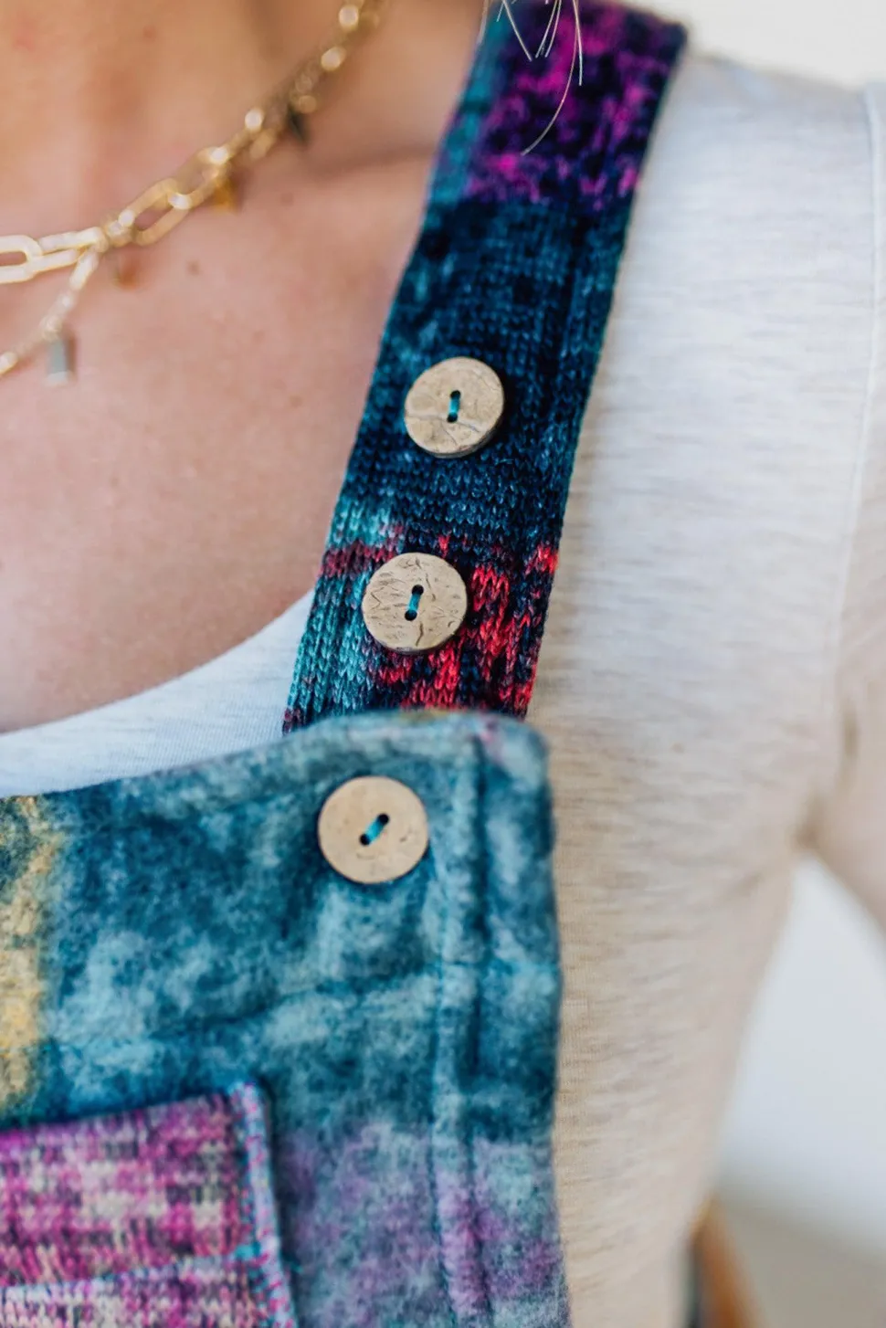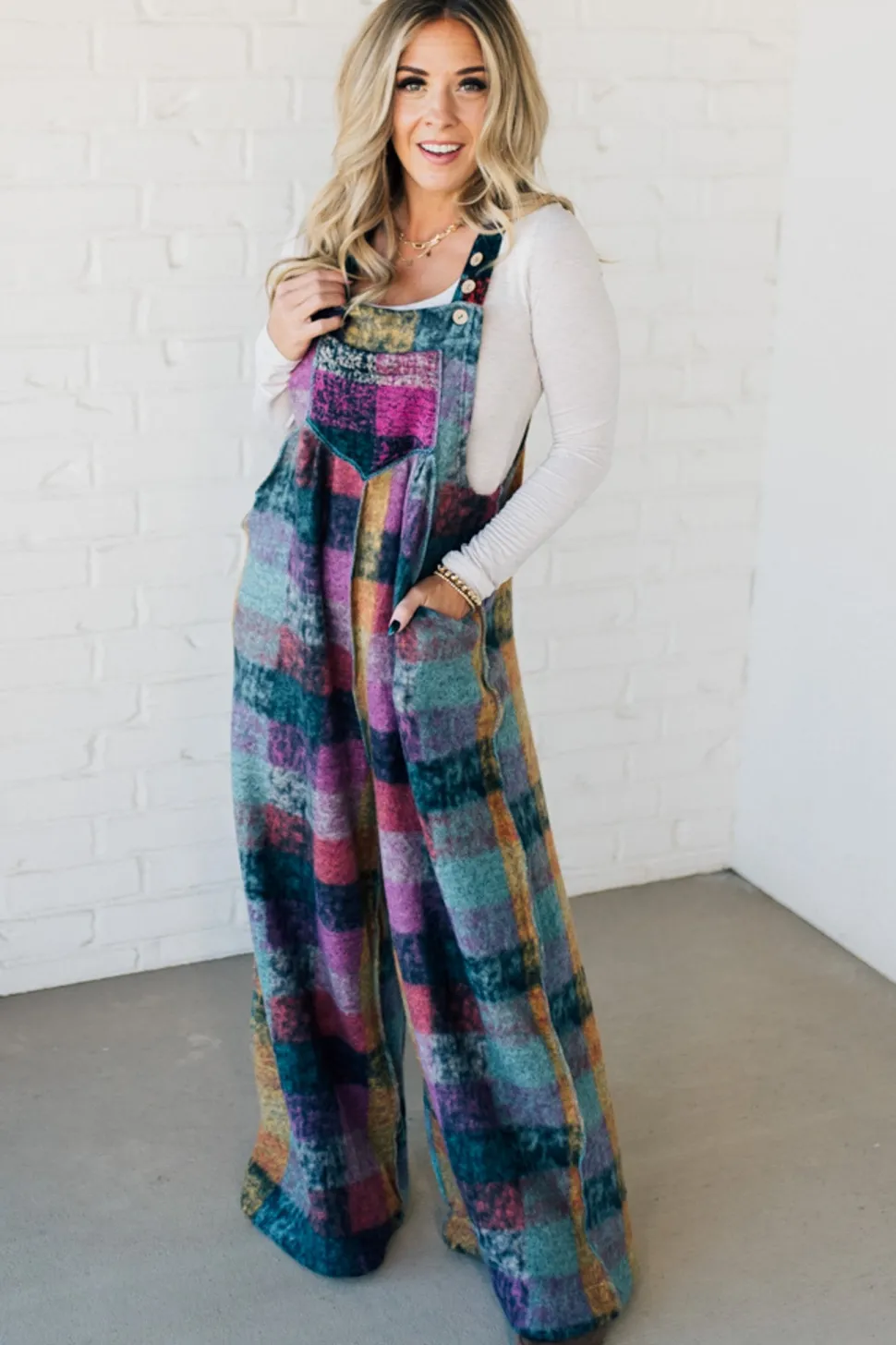 Add some sass to your wardrobe with our Brushed Multi Check Overalls! These soft and cozy overalls feature a playful multi-color plaid pattern and ultra-wide leg fit. The adjustable button straps make for a customizable and comfortable fit. A perfect addition for those looking to make a statement (and stay warm!) this season.