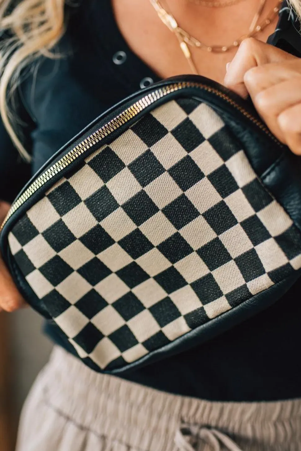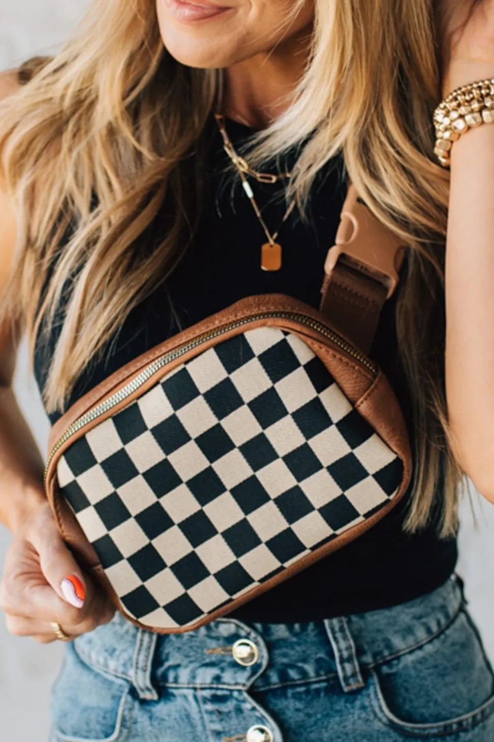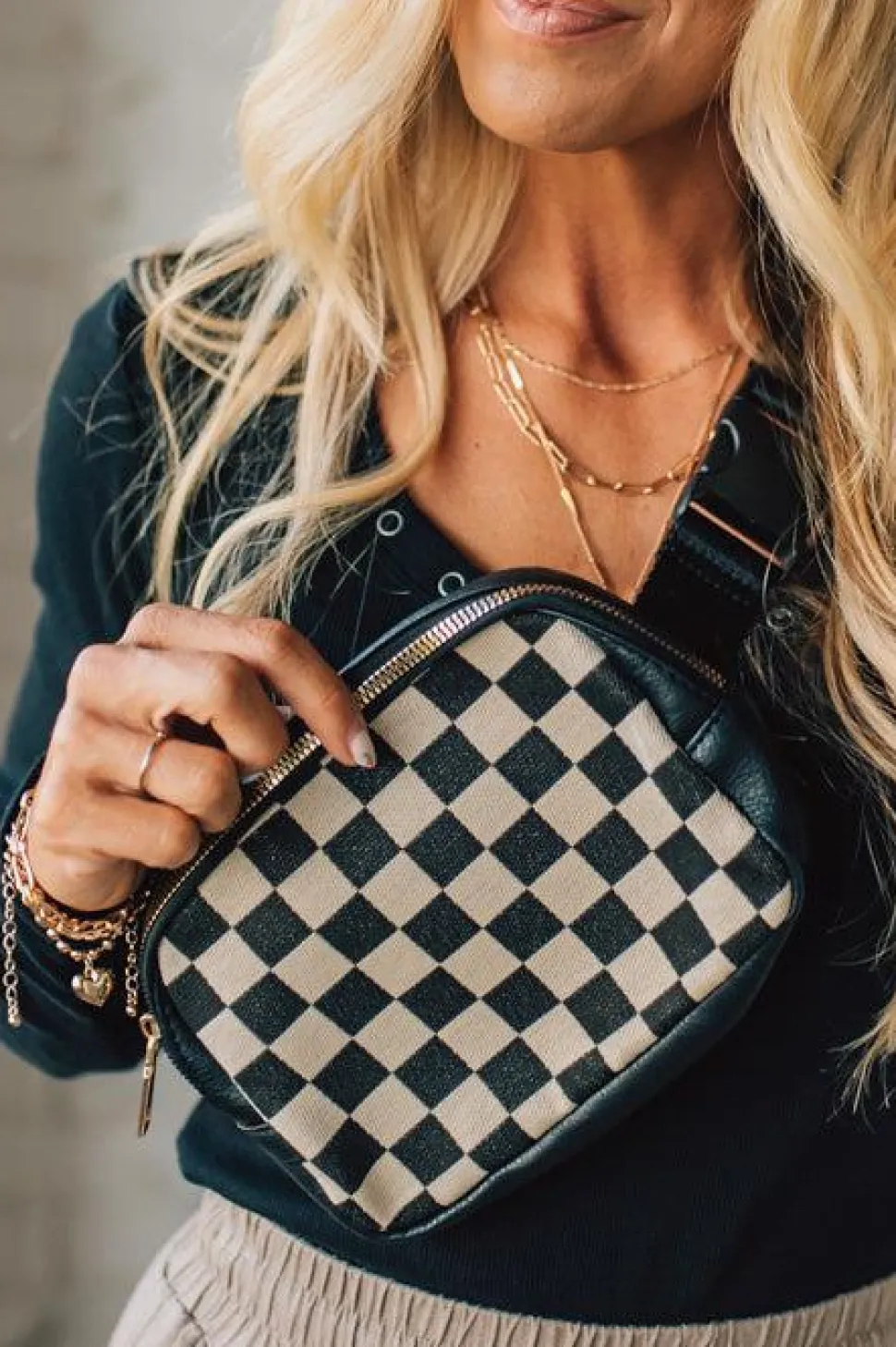 With a sleek vegan leather and canvas body and a pop of checkered charm on the front, this sling is where style meets sanity. Gold hardware gives it that polished finish, while the adjustable canvas strap lets you wear it high and tight or low and chill—your call.