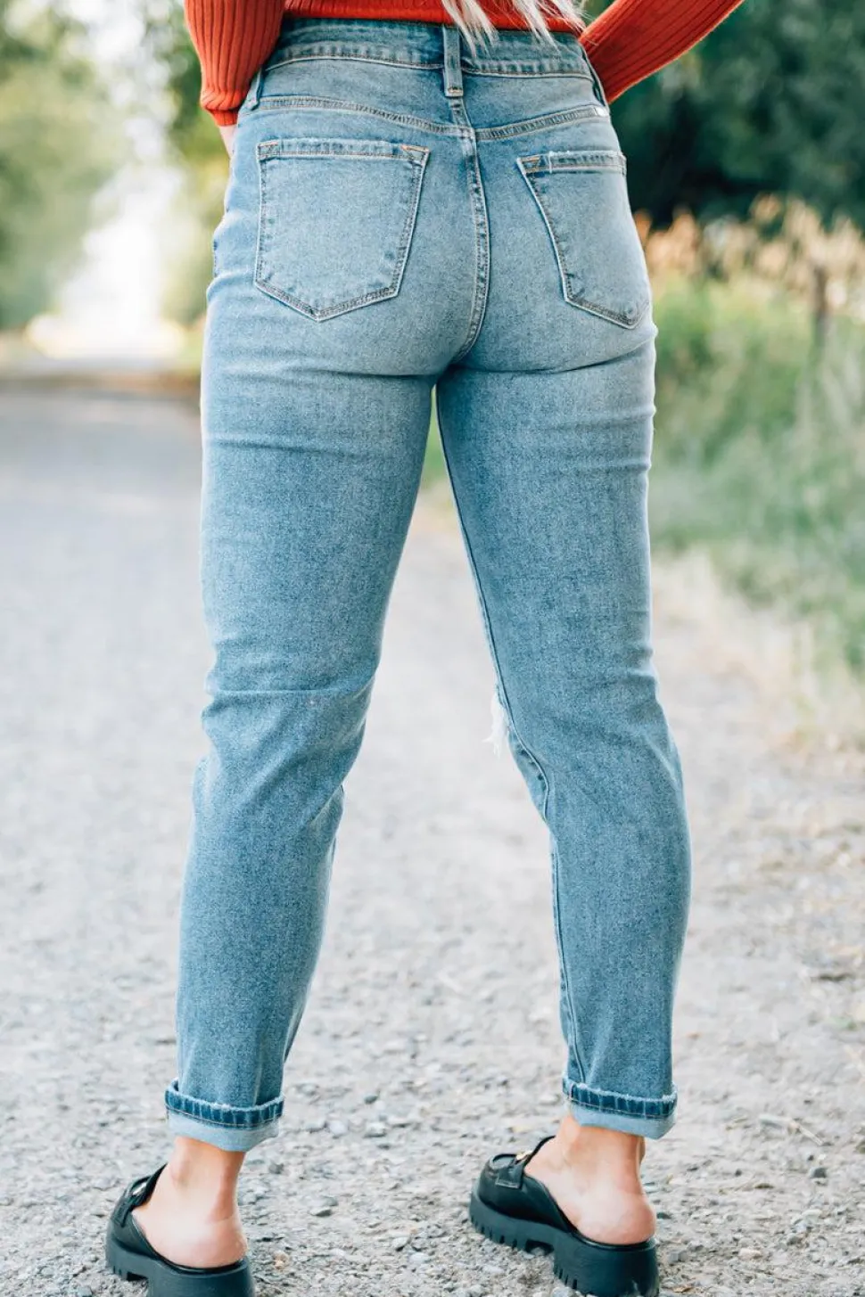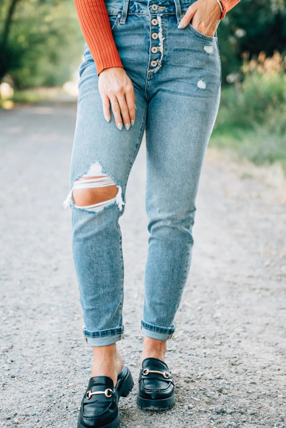 High rise, ripped girlfriend jeans, giving you the ultimate tummy control! The distressed knees, and light wash are a perfect pair for a casual vibe! Structured waistline all the way around gives you a perfect fit! The frayed seam along the button front add a fun texture detail!