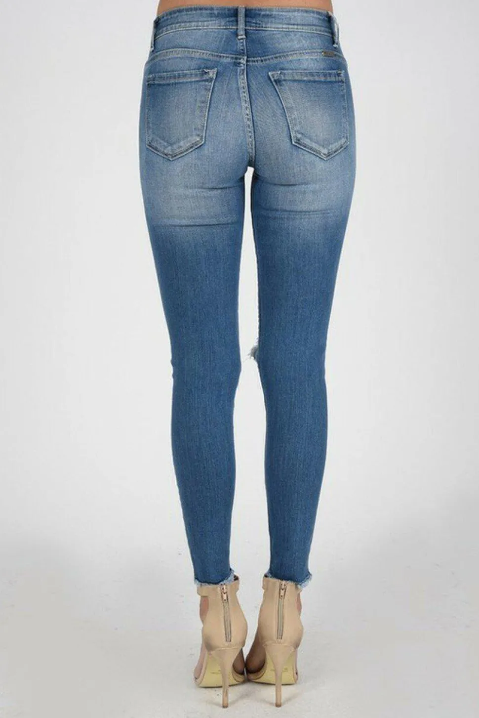 These are the ultimate pair of distressed skinny jeans to add to your rotation! The heavy distressing in the knee is perfectly complimented with the raw edge on the cuff. All coming together in one easy to wear pair of medium wash jeans!