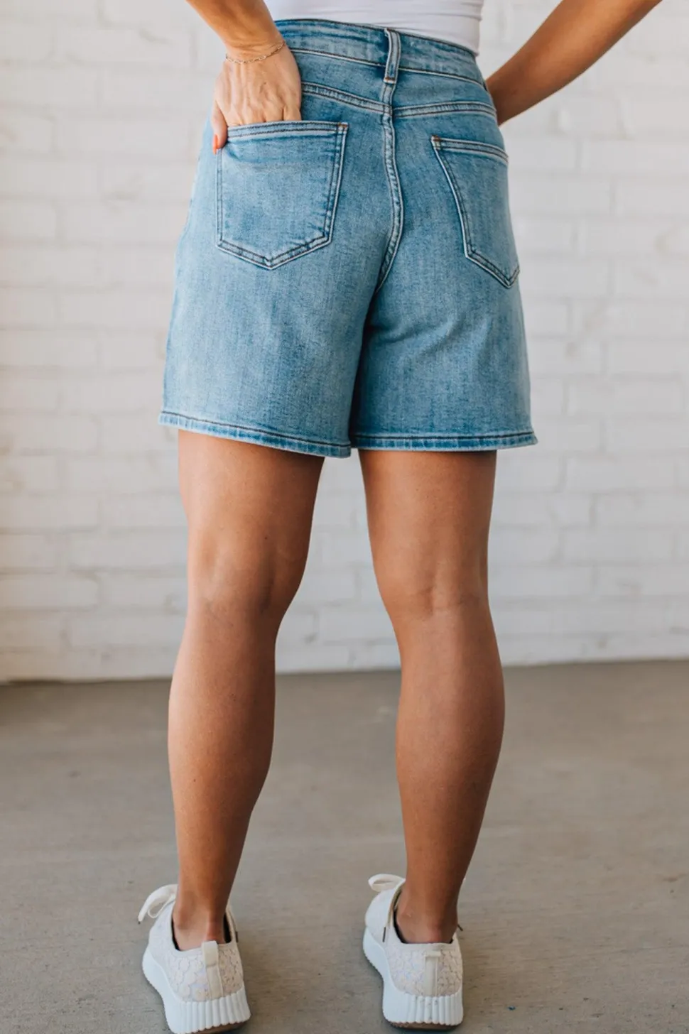 Upgrade your summer wardrobe with the Emmalie High Waist Mom Shorts. These denim shorts feature a stretchy high waist for a comfortable fit, along with a relaxed and wide straight leg design. The pocket detail adds a touch of functionality, making them perfect for everyday wear. Say hello to your new go-to mom shorts!