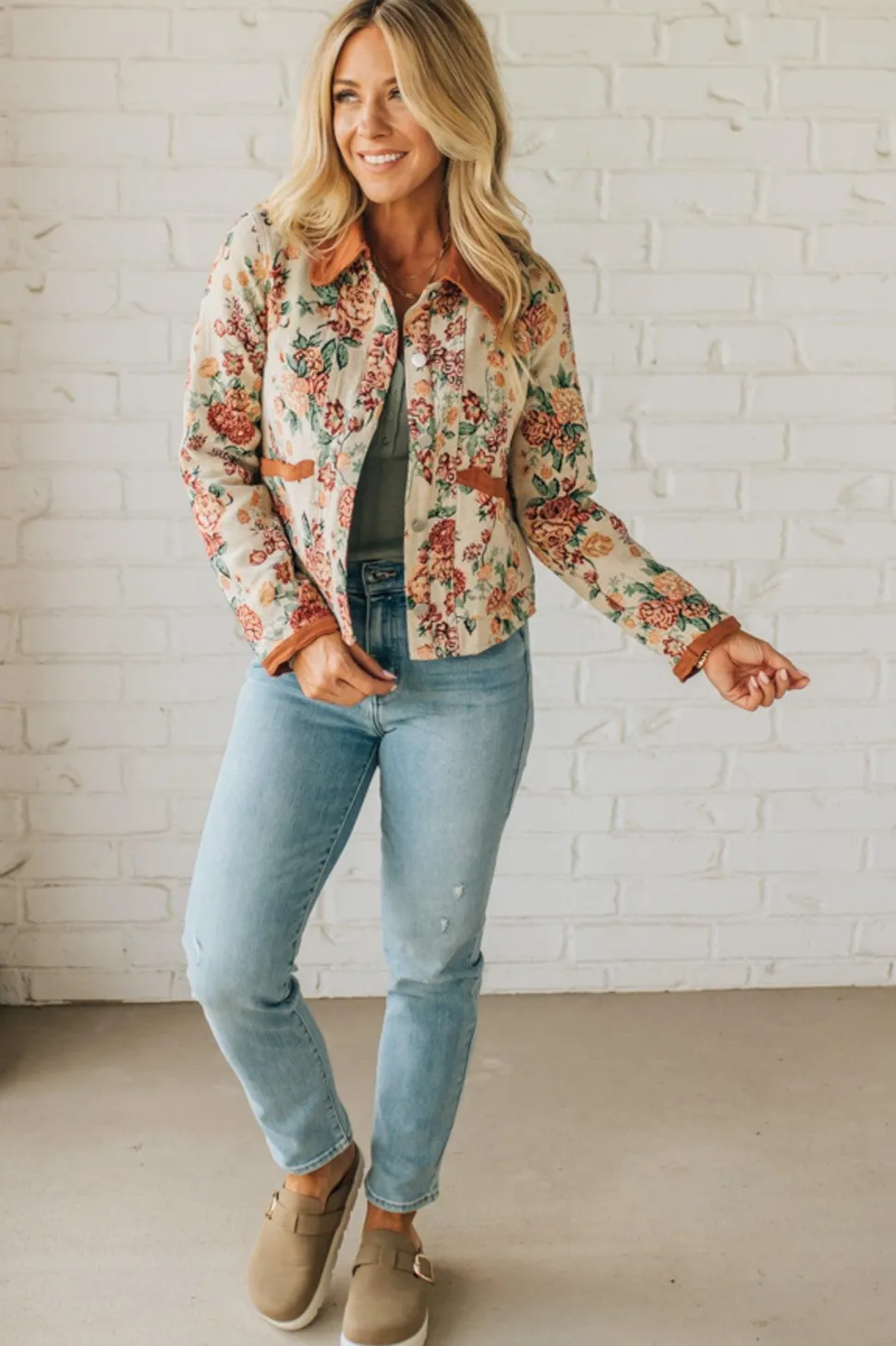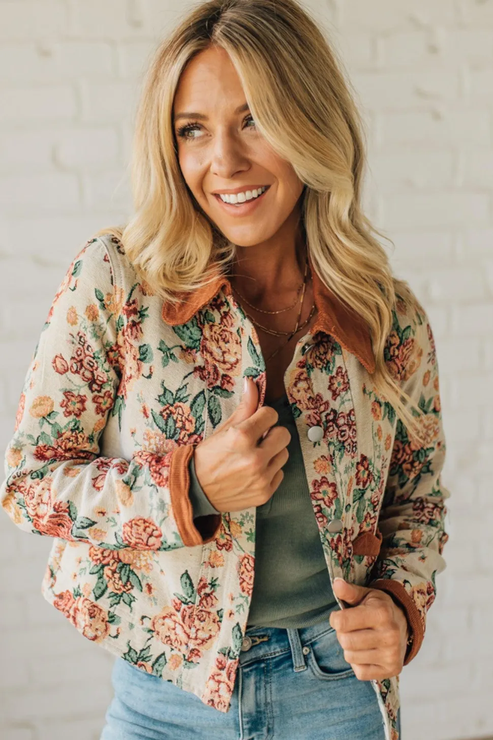 A warm, polished jacket for busy women and moms who want soft, comfortable pieces that look put-together from school drop-off to business calls. This Floral Jacquard Scallop Trim Jacket pairs a rust corduroy scallop edge with a floral jacquard body, making it an easy grab-and-go layer when you want cozy texture and thoughtful detail.