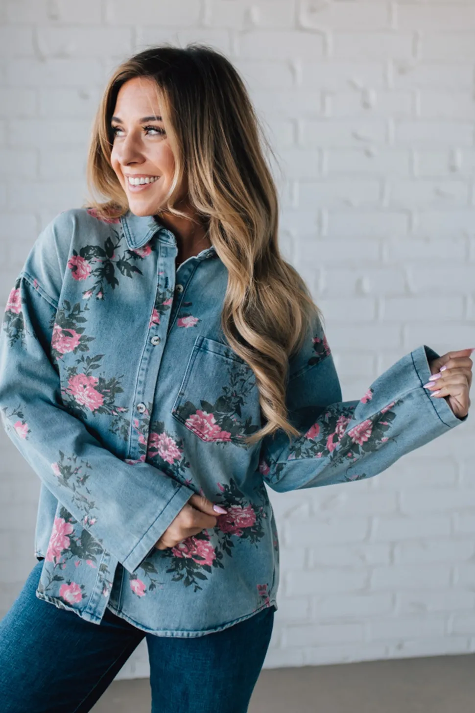 Add a dash of fun to your wardrobe with our Floral Print Denim Top. This playful and quirky shirt features a colorful flower print, and is made with lightweight denim fabric for comfort. With a button-up design, it’s perfect for any casual occasion. (Seriously, who doesn’t love a good floral print?)