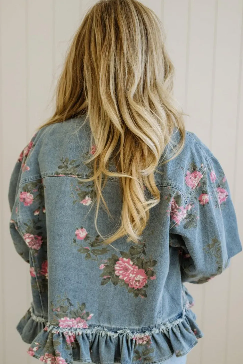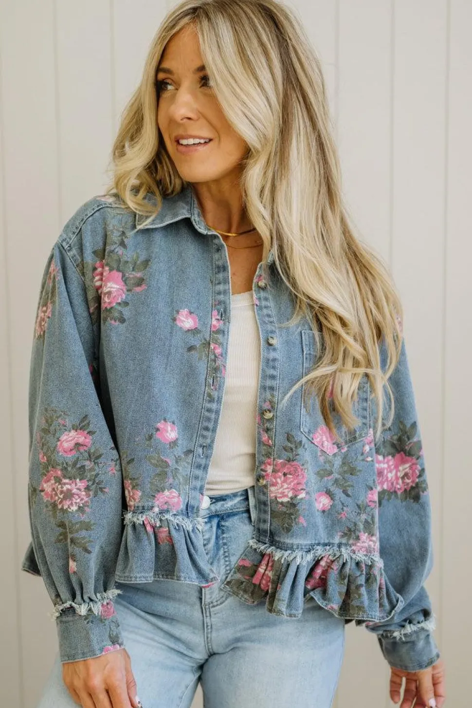The Floral Print Ruffled Denim Jacket is your spring-meets-denim dream. Lightweight and washed to that just-right vintage blue, this 100% cotton jacket features an allover floral print that feels like a modern take on your favorite thrift-store score. The ruffled hem and cuffs add movement and romance, while the classic button-up shape keeps it grounded.