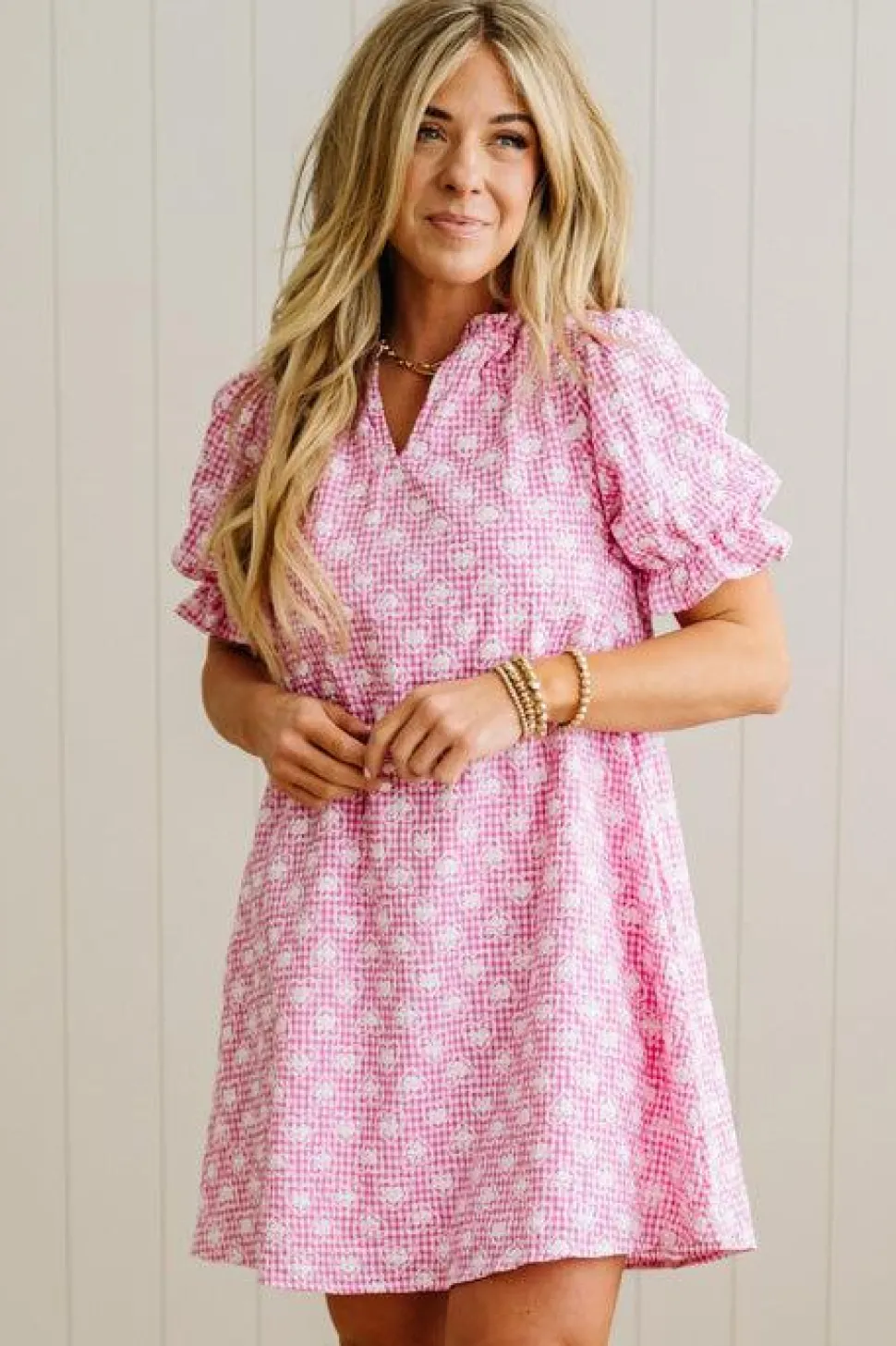 This dress is a love letter to all things sweet and vintage. The Gingham and Hearts Puff Sleeve Shift Dress brings a burst of retro charm with its pink gingham print and embroidered heart details—each one laced with little floral bouquets. It’s flirty, it’s feminine, and it’s the perfect “just wear the dress” kind of moment.