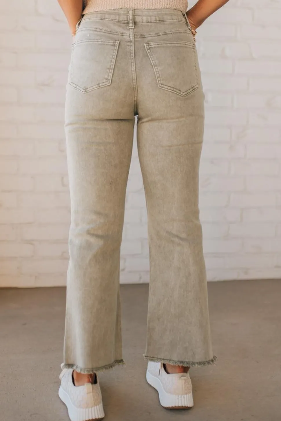 Elevate your denim game with the Haddie Frayed Hem Jeans in Light Olive. These high waist bootcut pants feature a playful acid wash and frayed hems, adding a touch of edge to any outfit. Get ready to turn heads and make a statement! (No more boring jeans for you!)