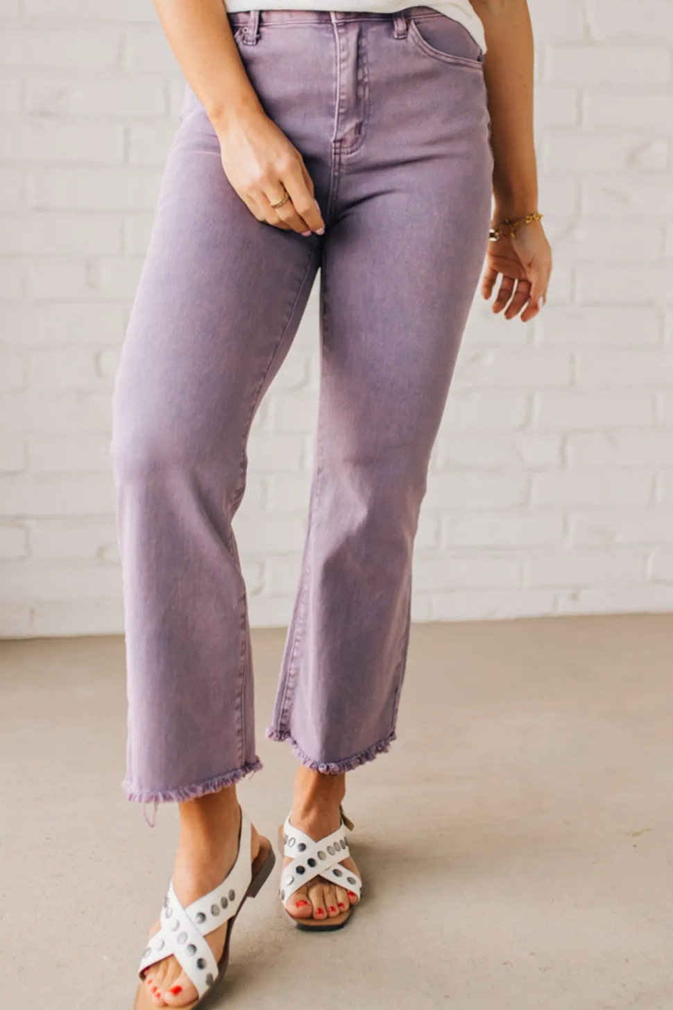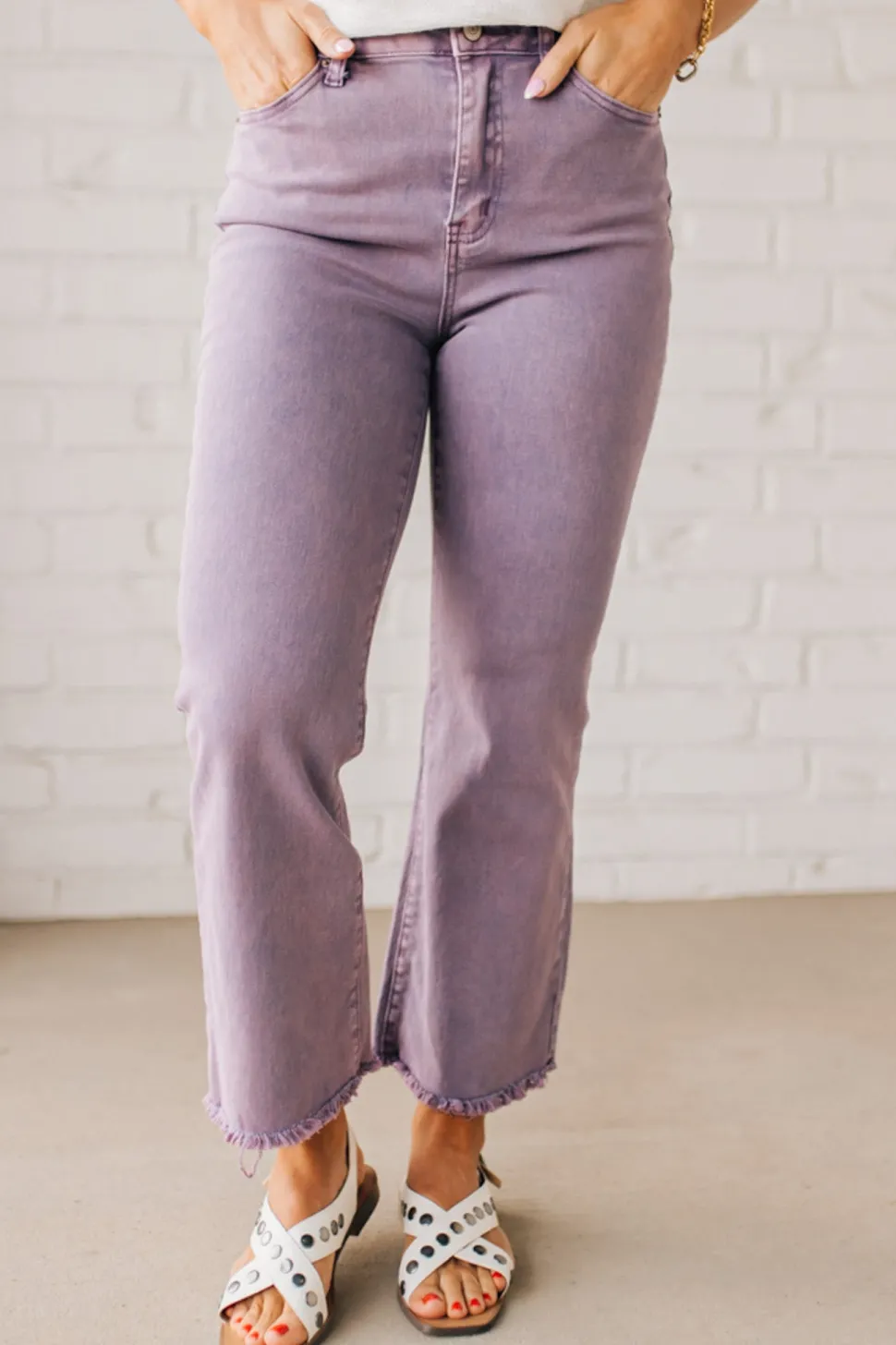 Elevate your denim game with the Haddie Frayed Hem Jeans in Light Plum. These high waist bootcut pants feature a playful acid wash and frayed hems, adding a touch of edge to any outfit. Get ready to turn heads and make a statement! (No more boring jeans for you!)