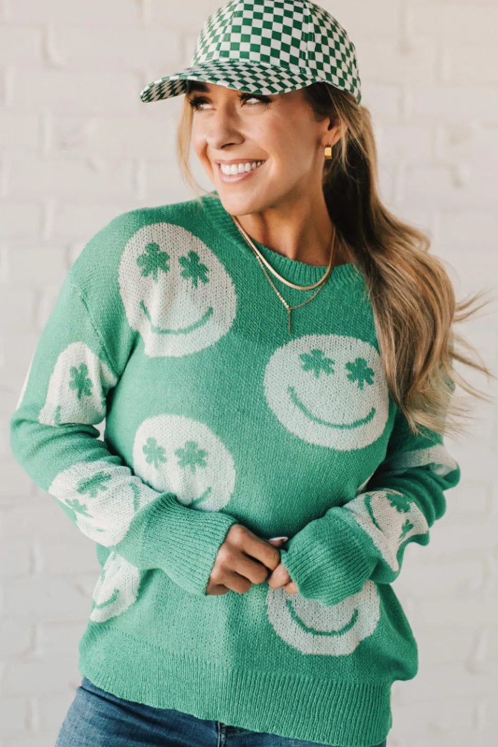 Add a pop of personality to your wardrobe with our Happy and Lucky Lightweight Sweater! This vibrant, low gauge knit sweater features a playful green and white smiley pattern with shamrock eyes, bringing a touch of luck and joy to your day. Get ready to stand out and spread some positive vibes with this unique piece!