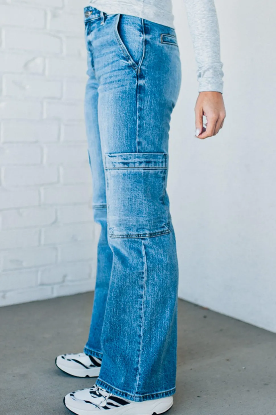 Expertly crafted for style and comfort, the Heather Mid Rise Cargo Jeans are a must-have addition to your wardrobe. With a low rise and comfortable stretch, these jeans feature a unique X-cargo design, side patch pocket, and knee seam detail for a touch of functionality. Available in a versatile medium wash, these cargo jeans will elevate your look effortlessly.