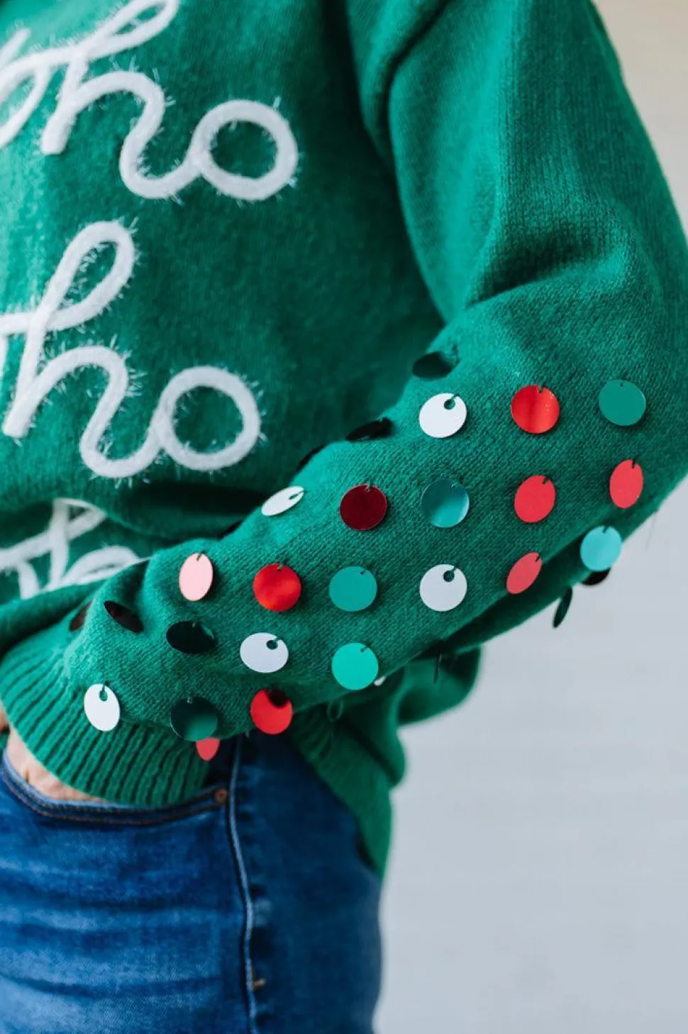 - Self: 100% Polyester | Spangled sleeve with slightly tilted tinsel ho ho ho lettering Christmas sweater | Drop shoulder construction | Large sequins on sleeve from elbow to wrist