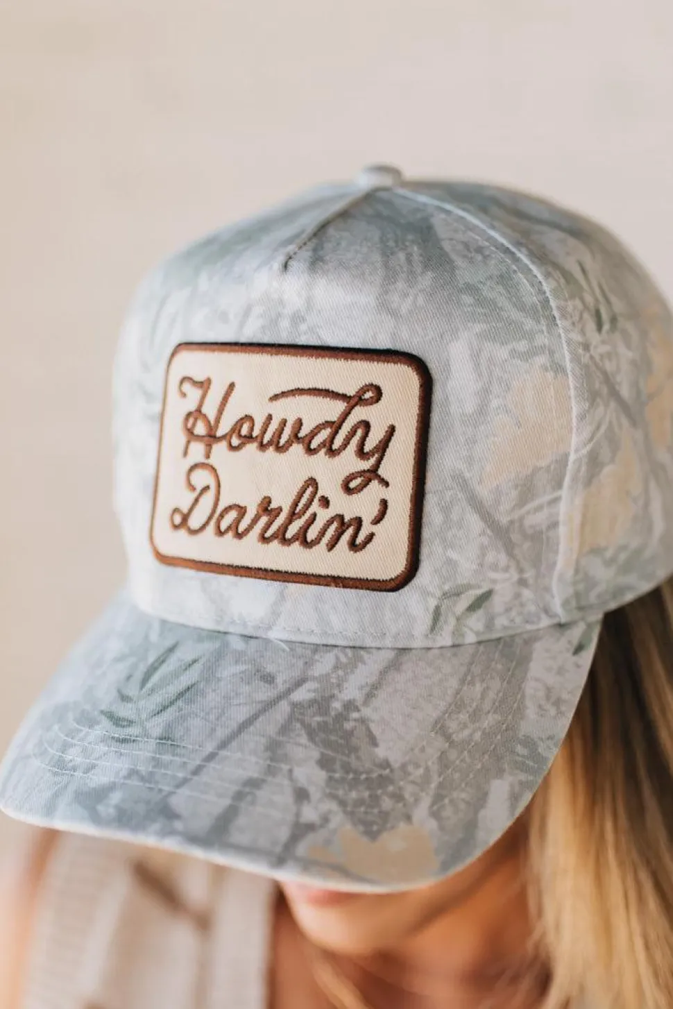 Add some country charm to your outfit with the Howdy Darlin Hat. Featuring a Realtree camo print and a playful “Howdy Darlin” embroidery patch, this 5-panel structured trucker hat is made from 100% cotton for comfort and style.