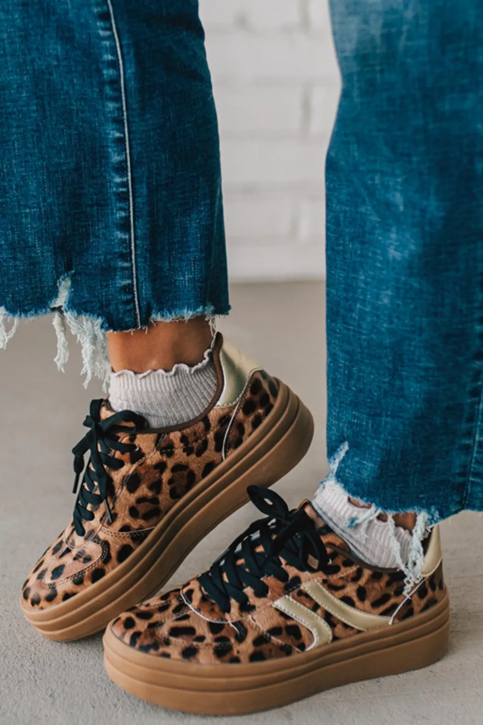 Step up your sneaker game with the Kimmy Double Stripe Sneakers. These leopard print platform sneakers feature a playful pop of black and gold with a double stripe design. Comfort and style meet in the perfect combination. (Pair with any outfit for a quirky and fashion-forward look!)
