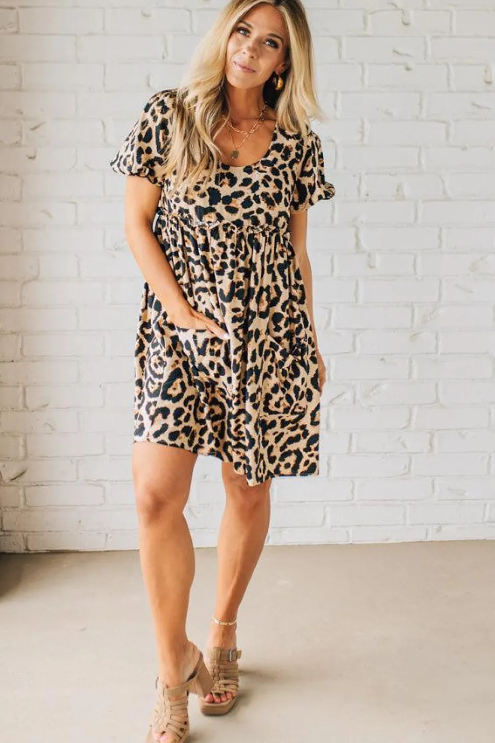 Leopard Tie-Back Puff Sleeve Dress — Sweet From the Front, Sassy From the Back. Some dresses whisper. This one flirts. The Leopard Tie-Back Puff Sleeve Dress is your go-to when you want to bring the charm and still cause a little stir. With soft puff sleeves, a flattering empire waist with ruffled seaming, and a flirty open-back cutout tied in a bow, this dress is made for date nights and golden hour moments. The nylon-rayon blend drapes beautifully without clinging, and patch pockets give it bonus points for real-life wearability.