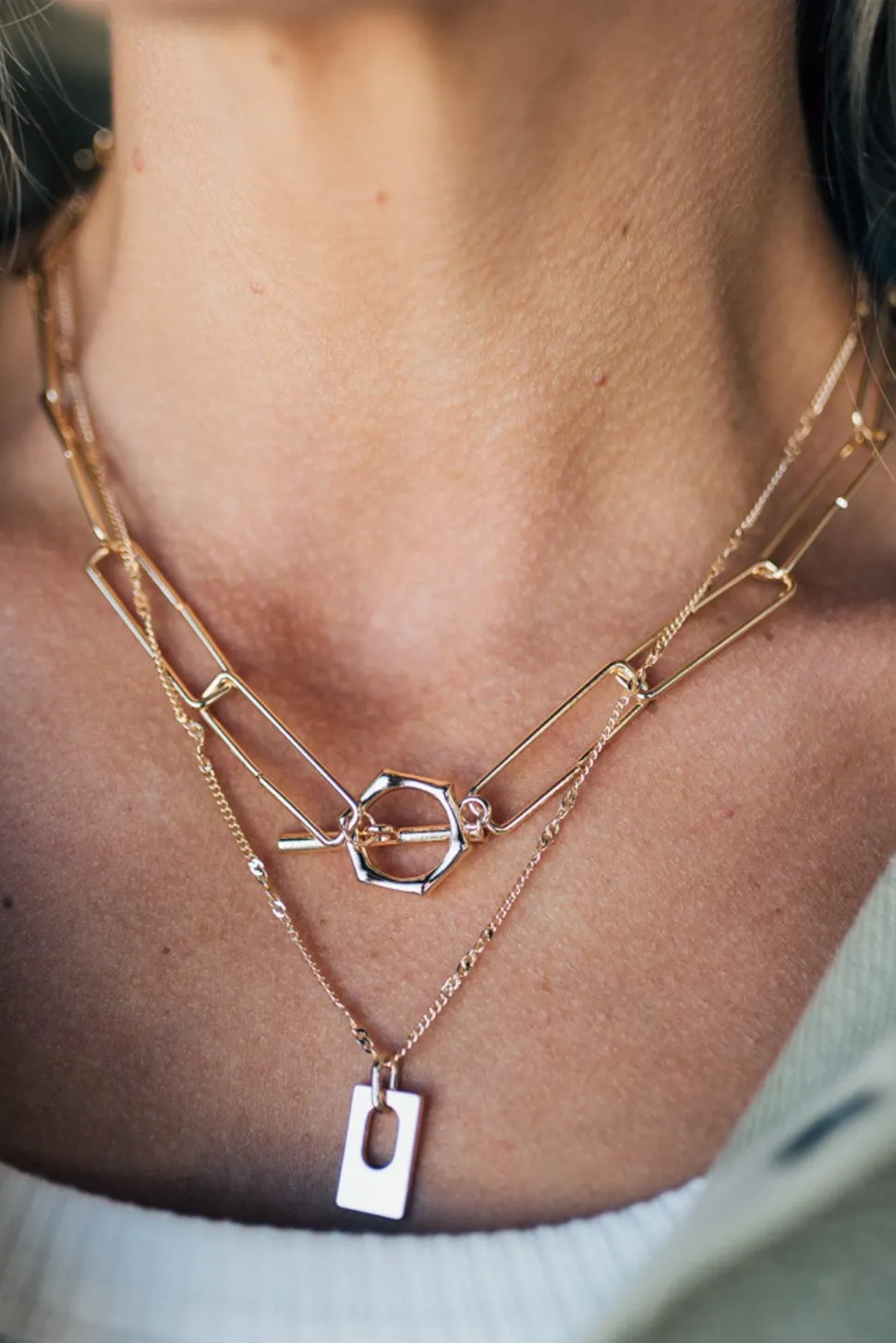 Enhance any outfit with the versatility and style of our Link Layered Necklace. This two row necklace features a unique link chain with a secure hexagon toggle closure, paired with a delicate chain and cut out dog tag. Elevate your look with this elegant and modern accessory.