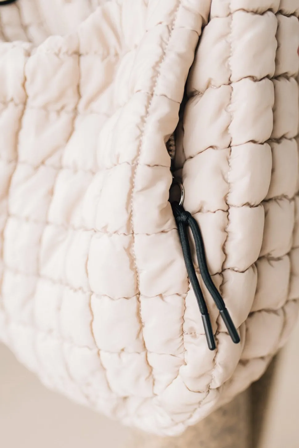 Introducing the Lizzie Quilted Puff Tote, a playful and spacious tote made from durable nylon. With stylish black toggles on the zippers, this bag is perfect for any occasion. Stay organized and stylish with this unique tote!