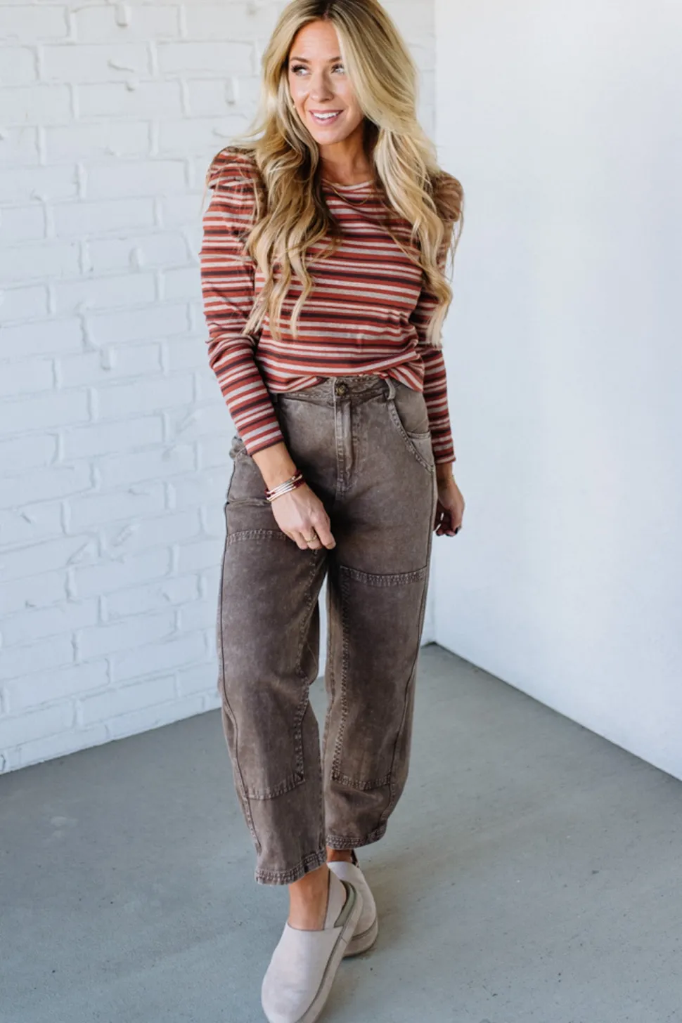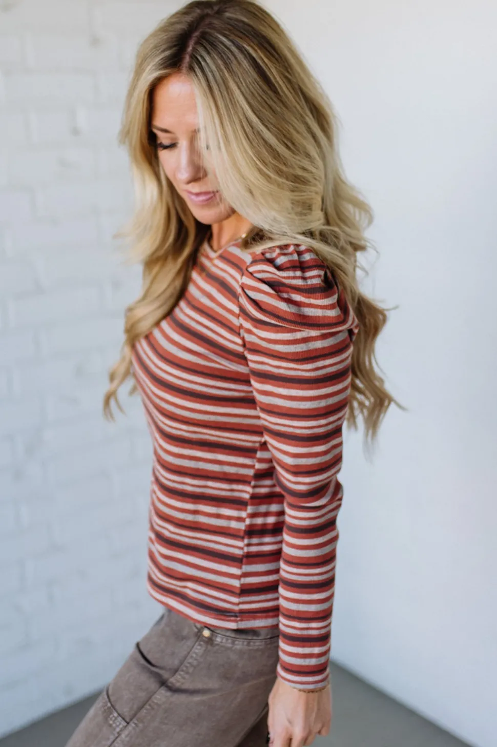 For the girl who lives in neutrals but still wants something special. The Maizy Striped Ribbed Top takes your everyday long sleeve and gives it just enough personality—thanks to puffed shoulders, a soft stretch rib, and a mix of mocha, blush, and warm brown stripes that play well with everything in your closet. It’s fitted but not tight. Sweet but not sugary. The kind of piece you’ll reach for on those “I want to look cute but don’t want to think about it” days.