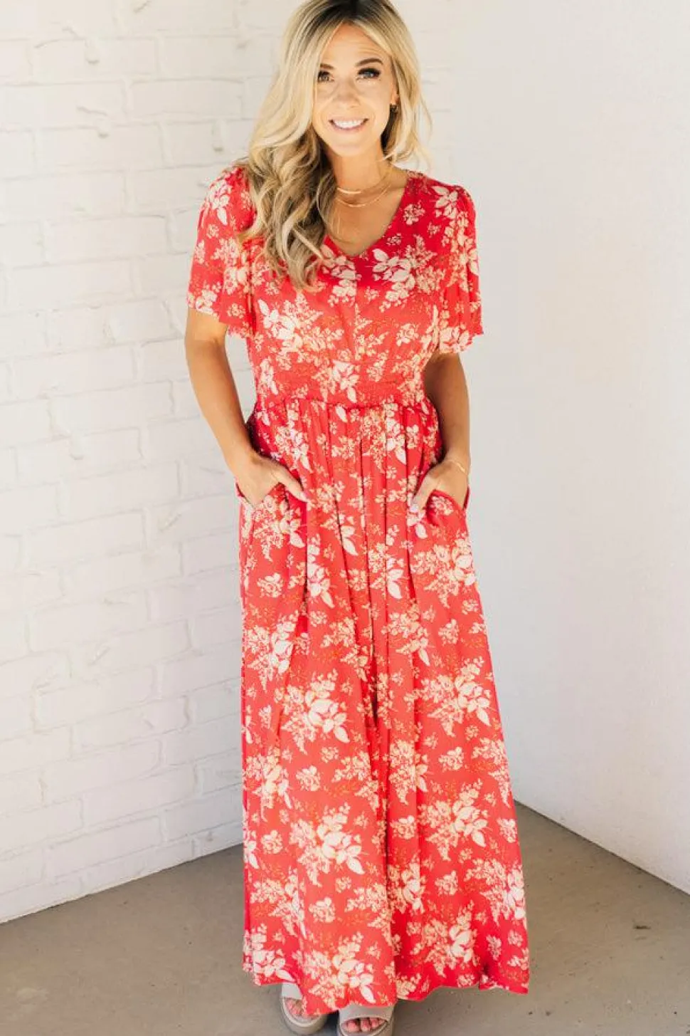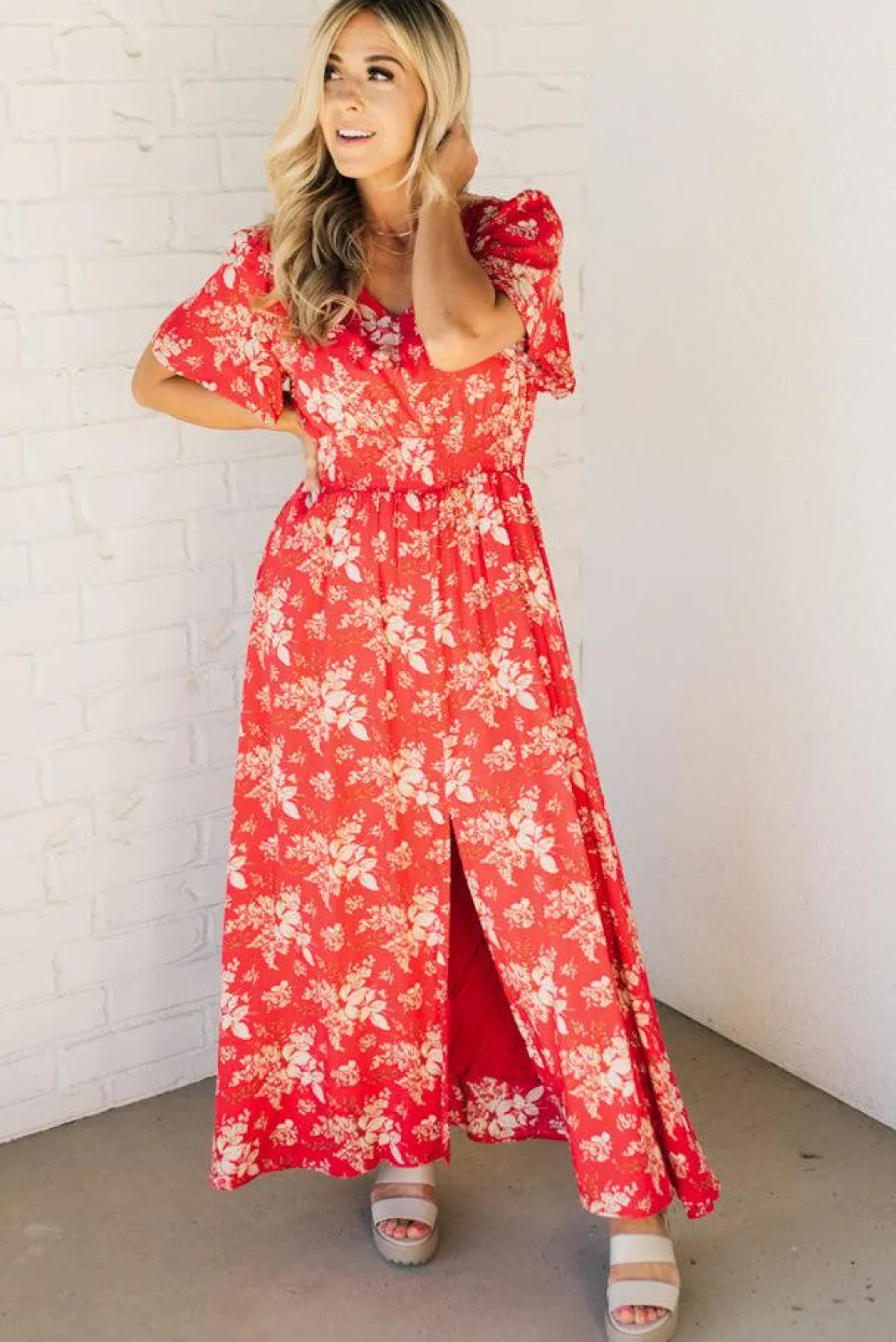 Pretty shade of bright red that we are dead over! This fun dress has a fully smocked waistline, with a center split front hem. The half, flowy sleeves are perfectly styled, and compliment the A-line shaped skirt of this beautiful dress!