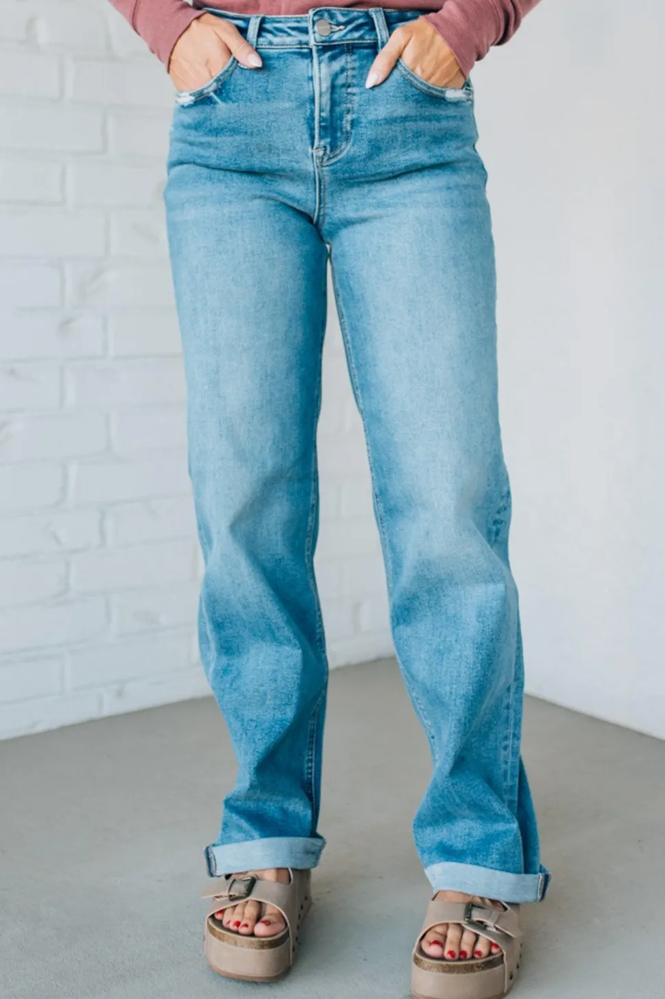 For laid-back weekends, downtown nights, and everything in between. These jeans bring a little ’90s nostalgia with a modern fit—high rise, roomy wide legs, and that perfectly faded wash. The cuffed hem gives you a cropped, casual vibe, but here’s the best part: unroll them and you’ve got 1.5″ of extra length for a longer, slouchier look. One pair, two moods.