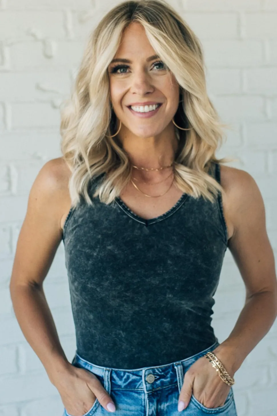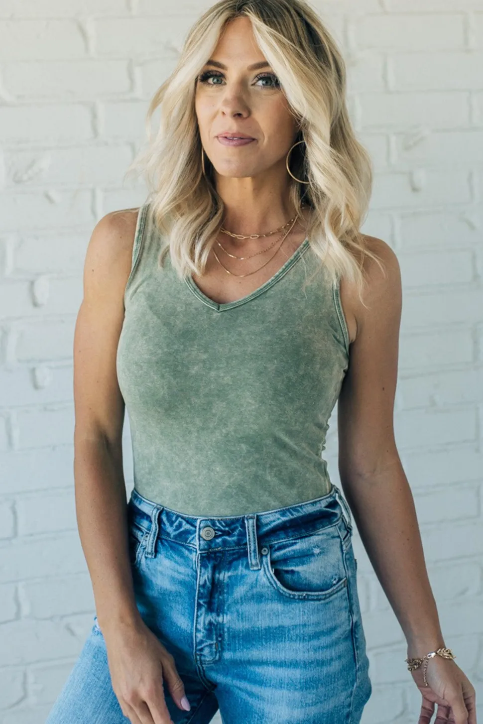 This Mineral Wash V-Neck Bodysuit offers a stylish take on the classic tank top silhouette. Crafted from a lightweight and stretchy acid-washed fabric. Underneath, this v-neck bodysuit features a double snap closure for a secure fit and full coverage. Perfect for any stylish wardrobe. If between sizes, we recommend sizing up.