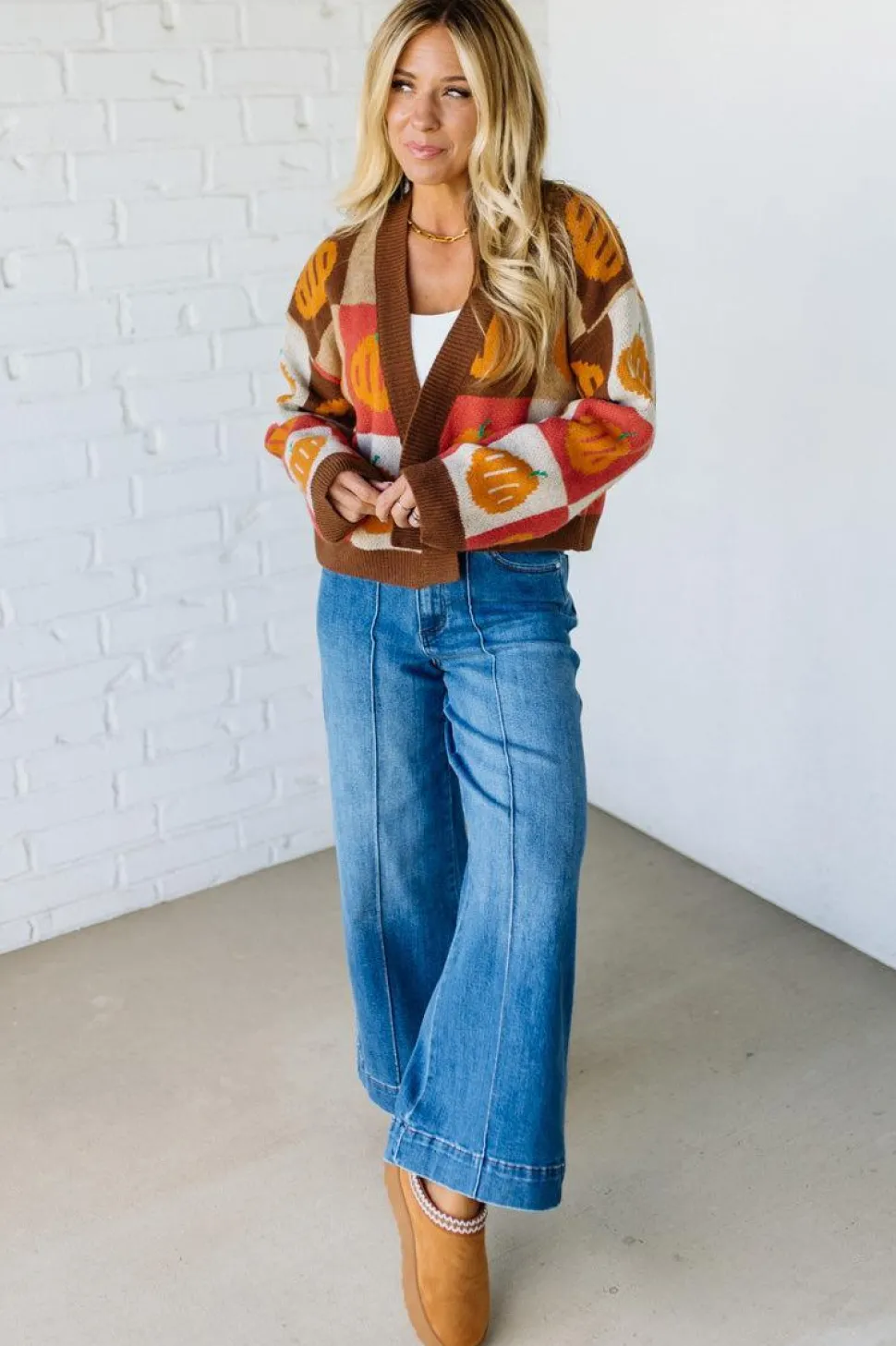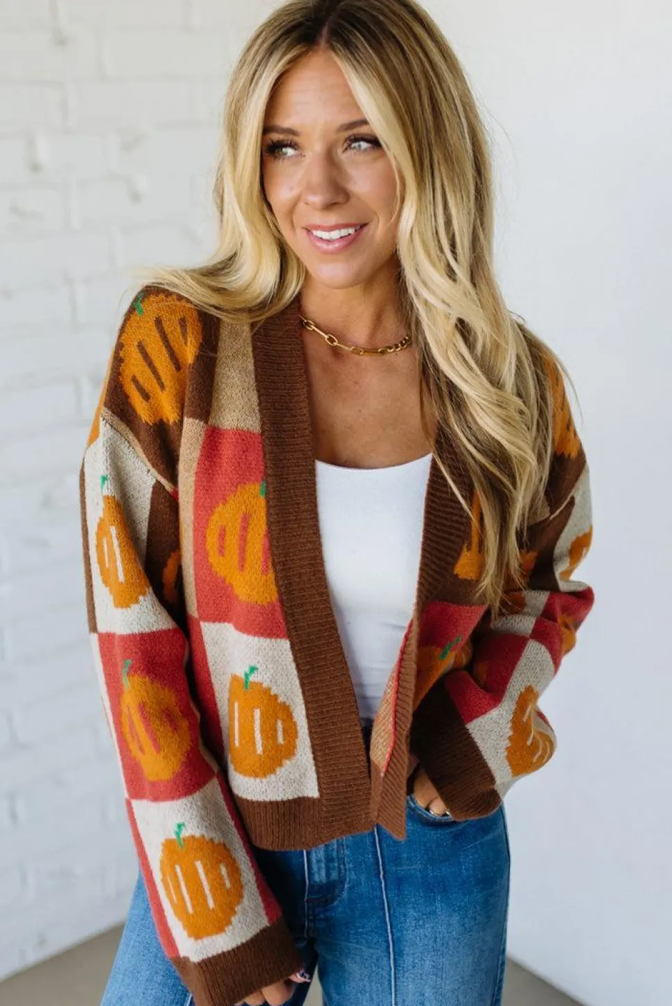 Ready to add cozy, wearable personality to your wardrobe? The Mod Pumpkin Crop Cardigan at RubyClaire Boutique brings warm brown, orange, and rust squares with modern woven pumpkins for a seasonal, versatile layer that fits your everyday life. Shop now to add this capsule-ready piece to your closet.