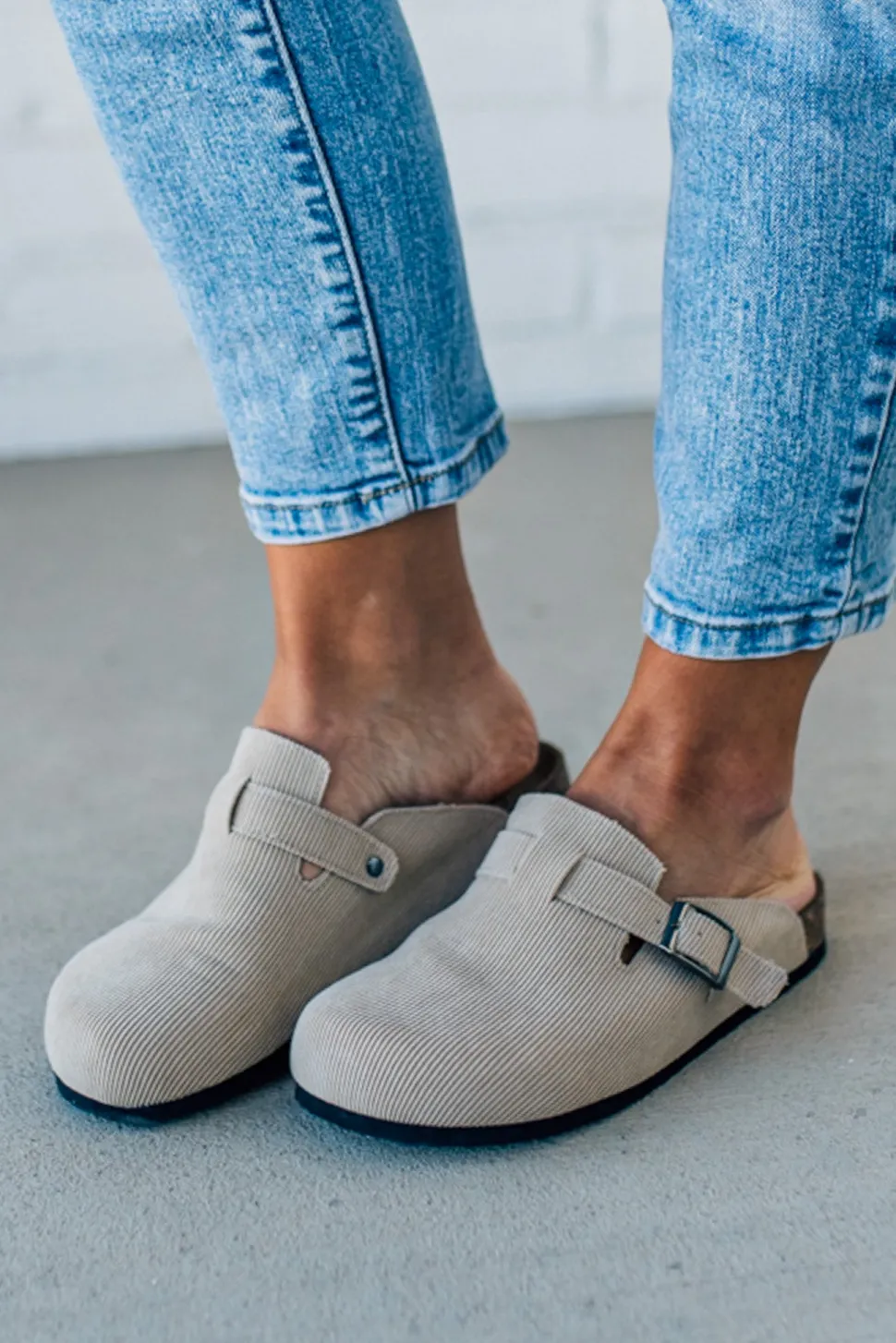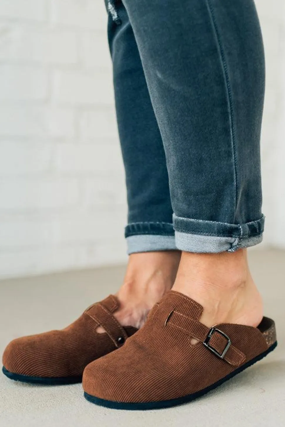 The Nolan Slip On Mules are a fashionable and comfortable option for every day. Crafted from soft mini ribbed corduroy and detailed with a cute side buckle, they provide a roomy wide width and easy on and off design. Perfect for work, play or a night out.