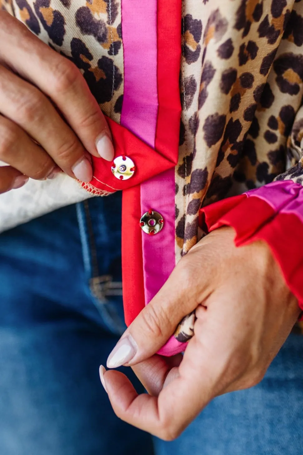 - Leopard printed top with red and hot pink striped wavy ruffle trim detail adds a fun pop at the neckline and cuffs, so you get a fashion-forward look without fuss.