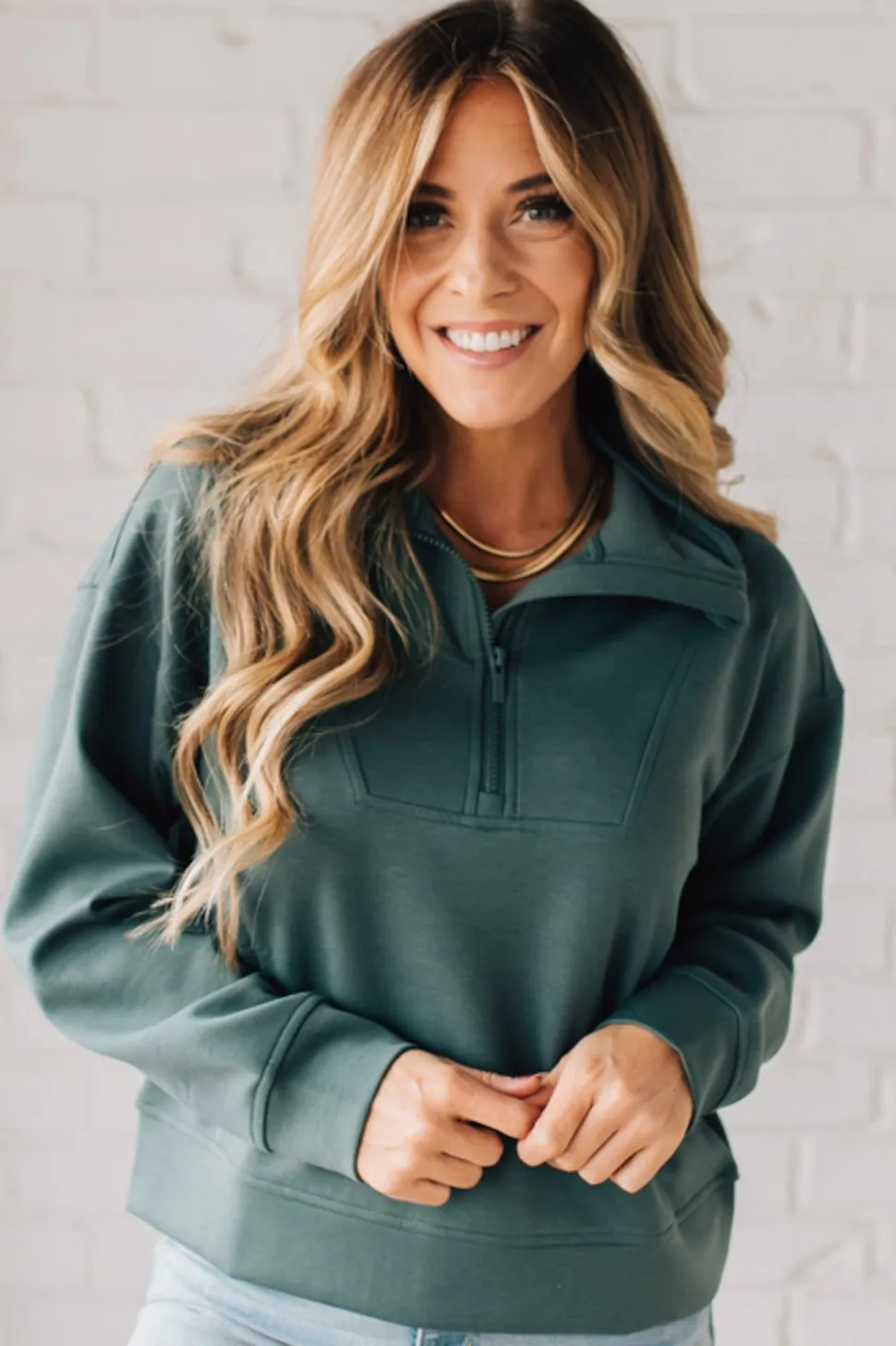 Unleash your playful side in our Quarter Zip Scuba Pullover. Made with scruba fabric, this athleisure waist length pullover features a quarter zip henley and kangaroo pocket. Perfect for the quirky and stylish individual, this pullover is versatile and comfortable, making it a must-have in your wardrobe.