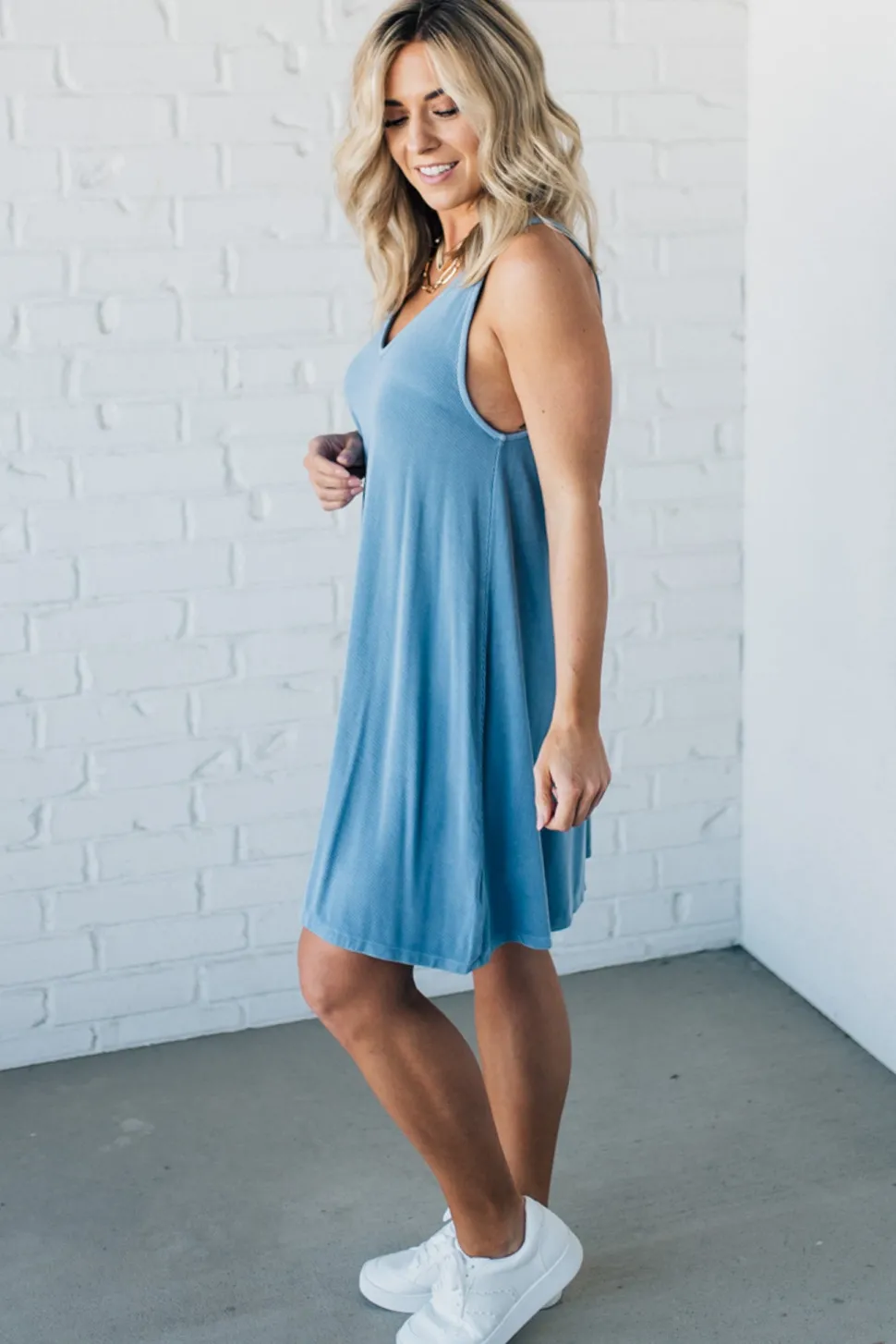Look fantastic in this super soft Ribbed Shift Dress! Its mineral wash and slim ribbed texture caress your curves, while the flattering deep V-neck and knee-length skirt will make those legs look legendary! Comfort never looked so good!