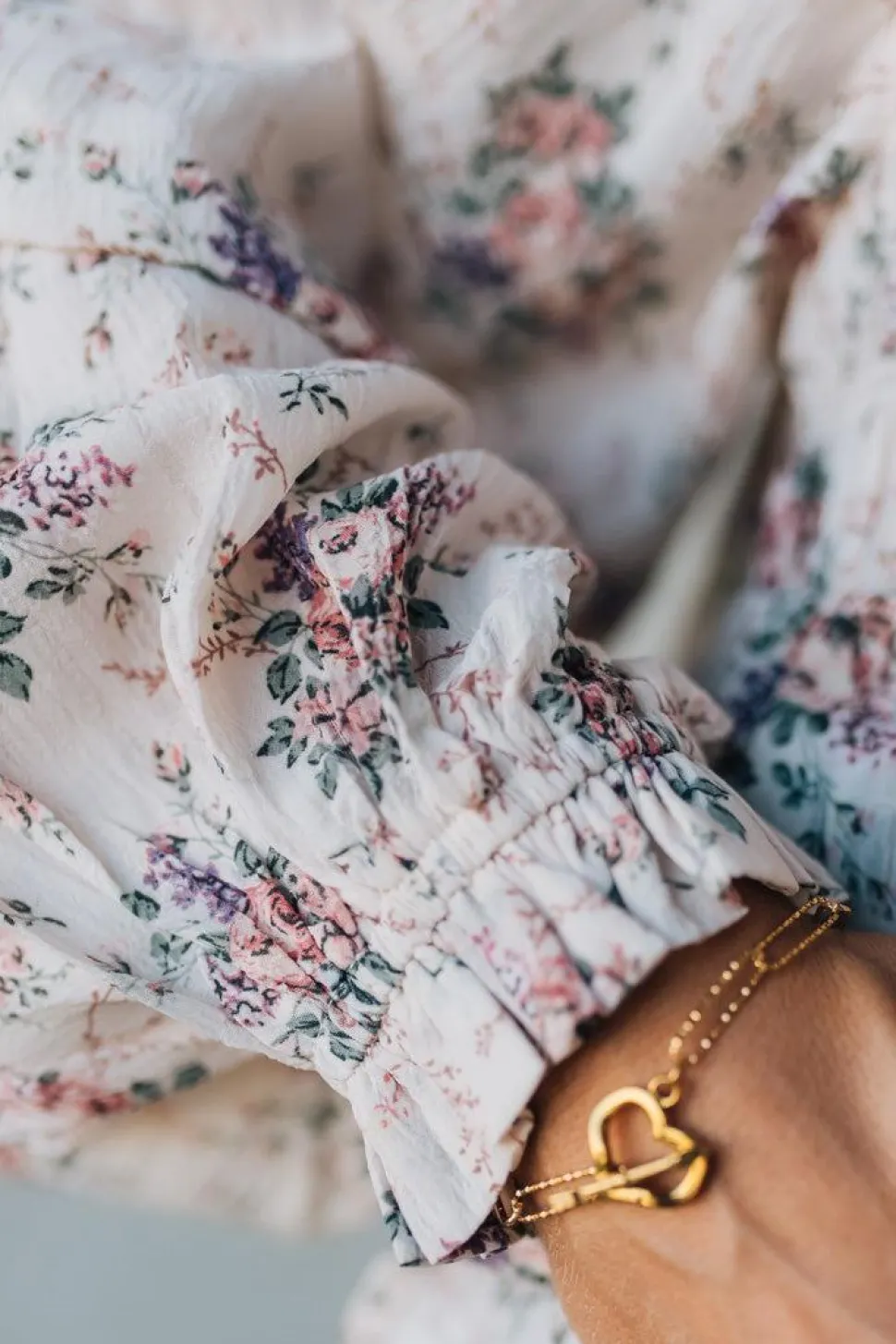 Buying for yourself or gifting someone who loves easy, polished style – this cream with pink floral printed woven V-neck top with smocked detail and balloon sleeves is perfect for spring brunches, workdays, and relaxed weekend moments.