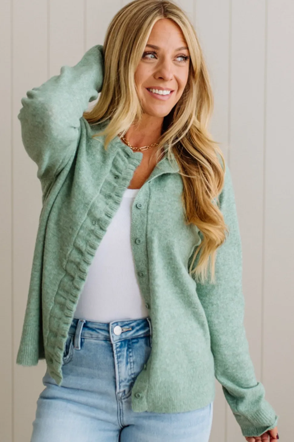 Like a warm hug with a feminine twist—this is the cardigan you’ll reach for on crisp mornings, coffee catchups, and cozy nights in. The Ruffle Trim Cardigan brings softness and charm with every detail, from the delicate frill along the neckline to the luxe knit blend that feels like a cloud against your skin.
