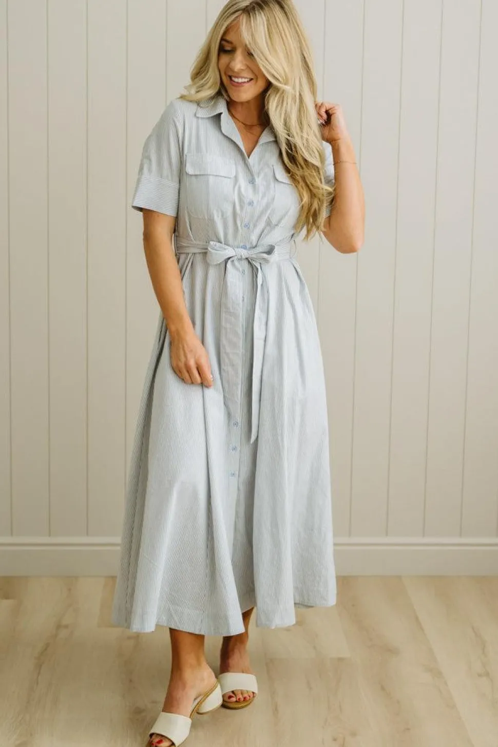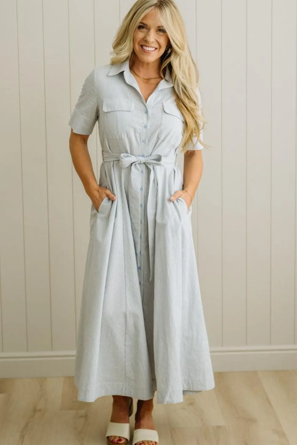 Crafted from a breathable cotton blend with subtle stripes, this tailored maxi features a classic shirt collar, double chest pockets, and a full button-down front. A belted sash cinches the waist just right, while an elastic back keeps it comfy. Add in the side pockets and you’re out the door.