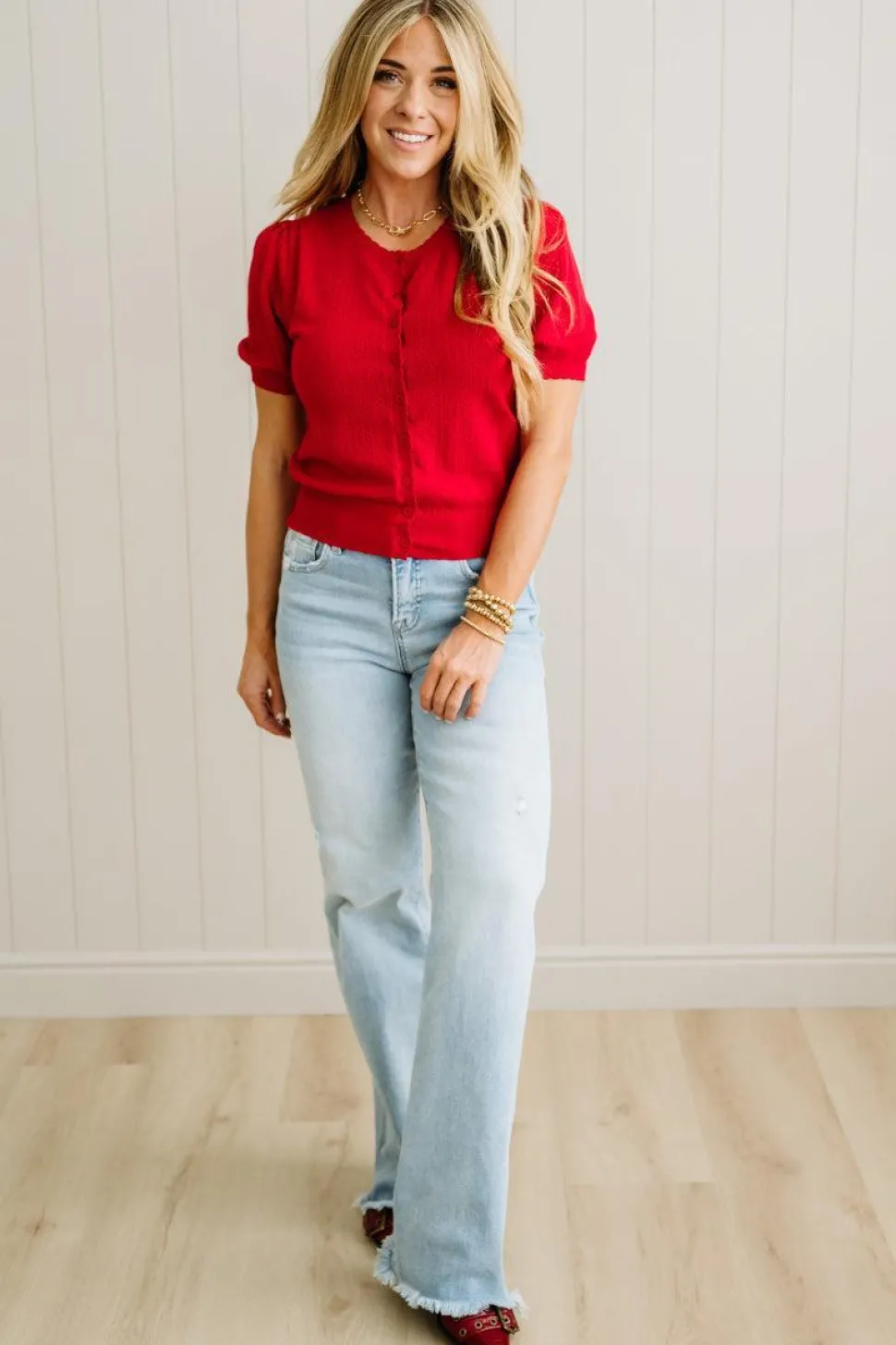 Picture this: the first sip of a vanilla oat latte, your favorite playlist humming in the background, and this romantic little cardigan layered just right. The Scallop Edge Pointelle Sweater Tee is made for coffee dates that turn into strolls and for dressing up denim without trying too hard.
