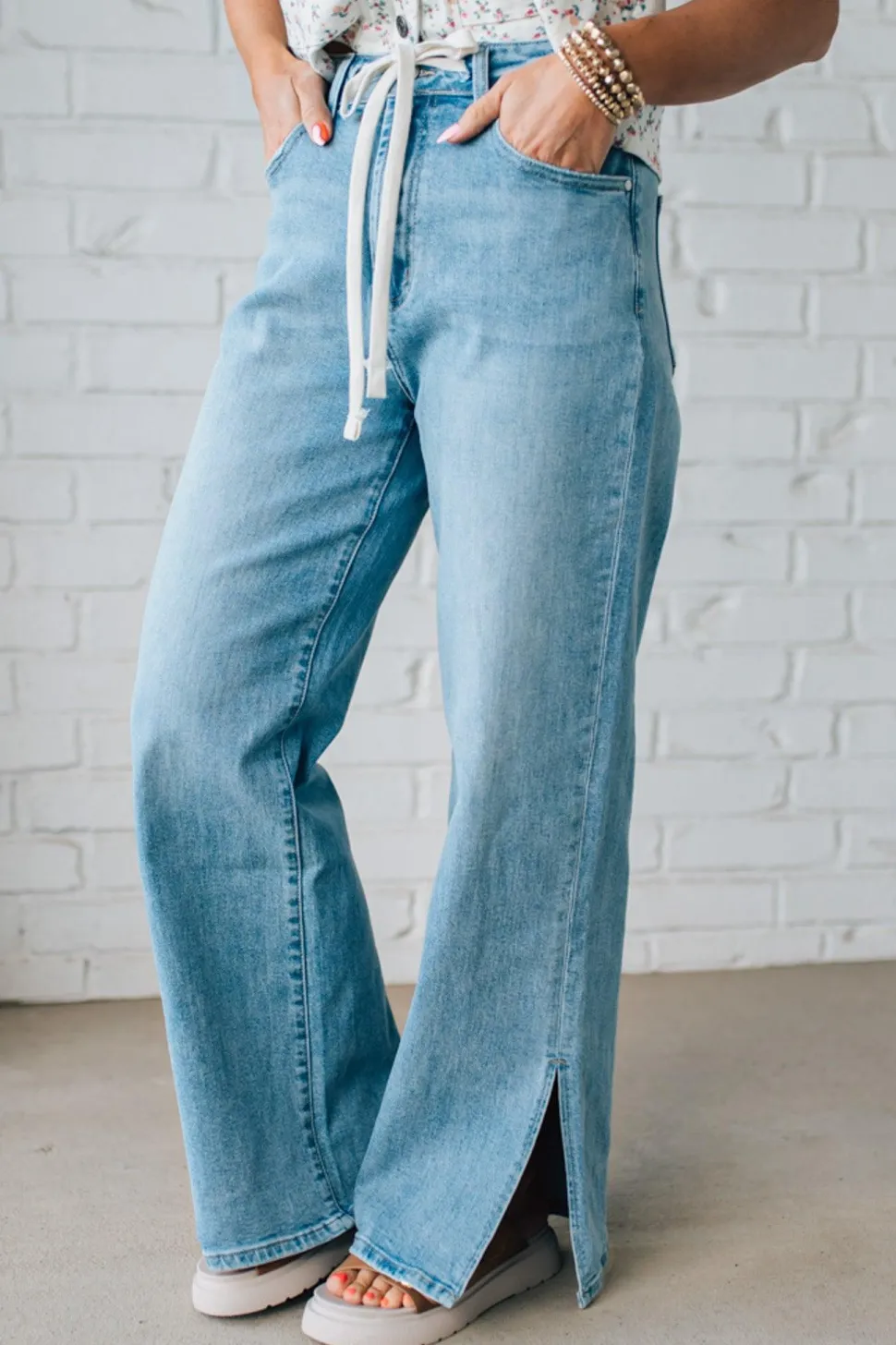 Upgrade to effortless style with our Sisiney Side Slit High Rise Drawstring Jeans. These medium blue wide leg jeans feature a unique drawstring waist detail and stretch fabric for a comfortable fit. Perfect for any occasion, these jeans will become a staple in your wardrobe. (Fashion meets function!)