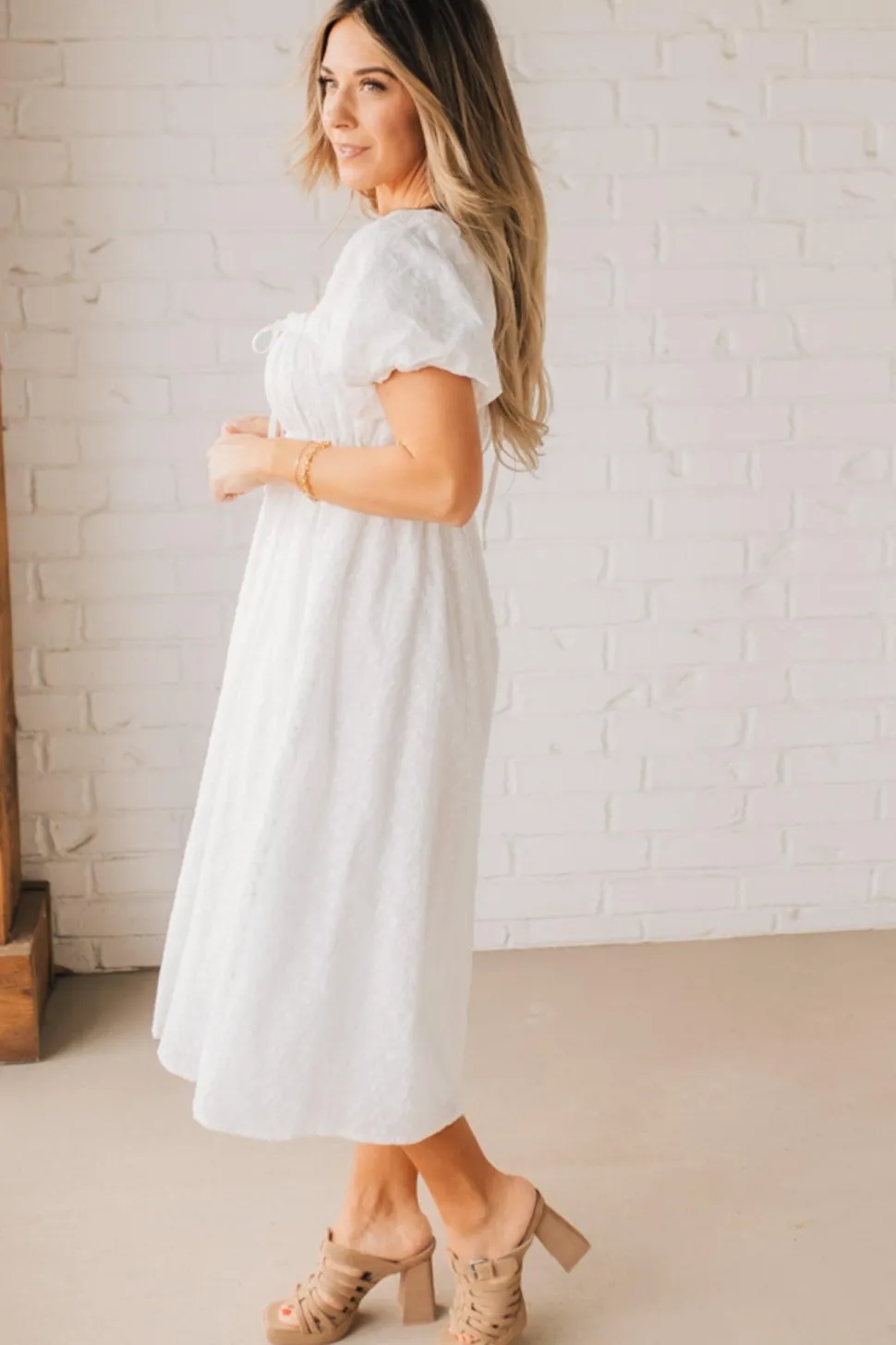 Fall in love with our Sweetheart Peasant Dress. Made with a square neckline and puff half sleeves, this white eyelet midi dress exudes both elegance and playfulness. Plus, the tie strap back adds a sweet touch to the overall look. Perfect for day or night, this dress will surely become a staple in your wardrobe.