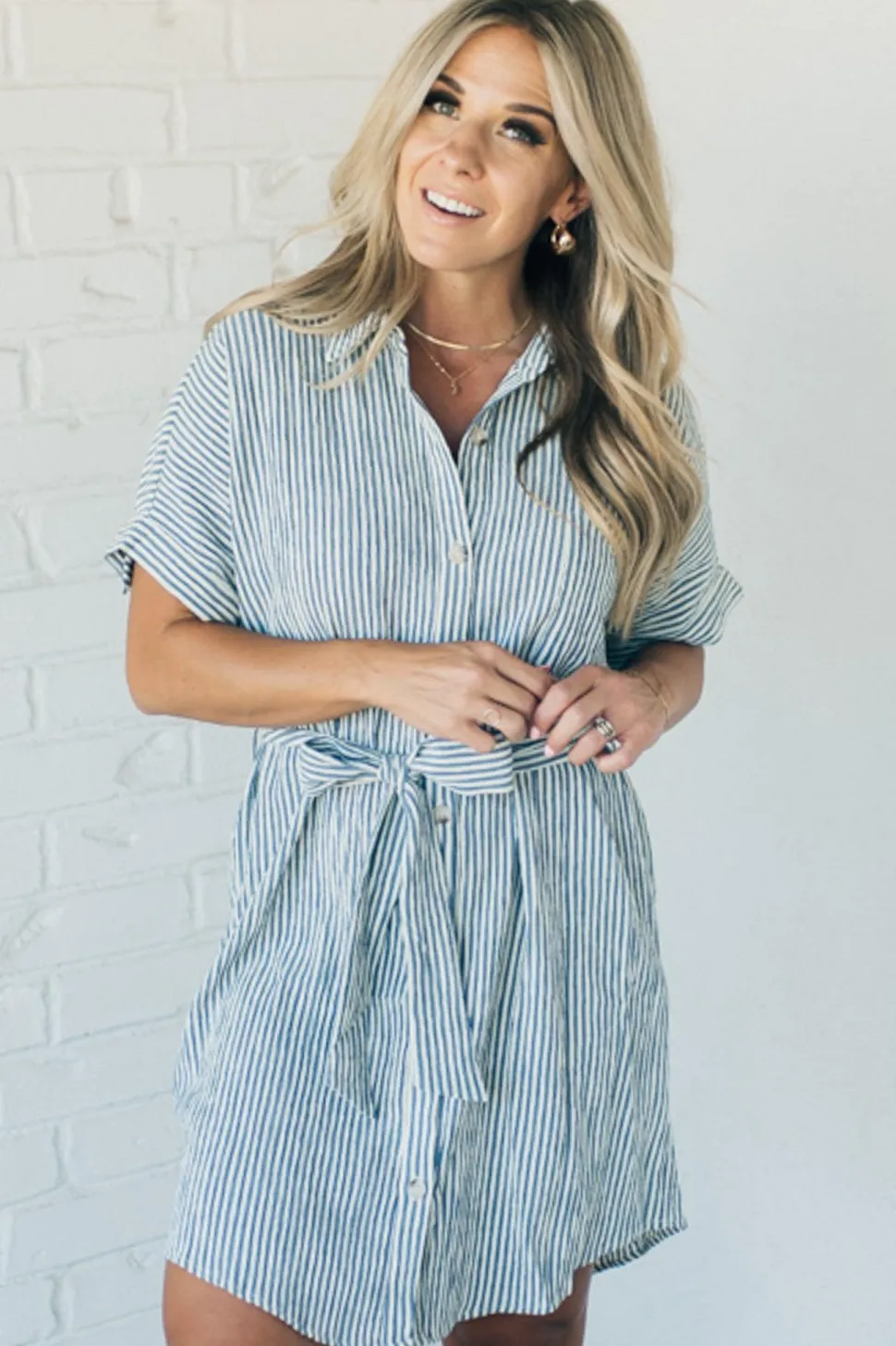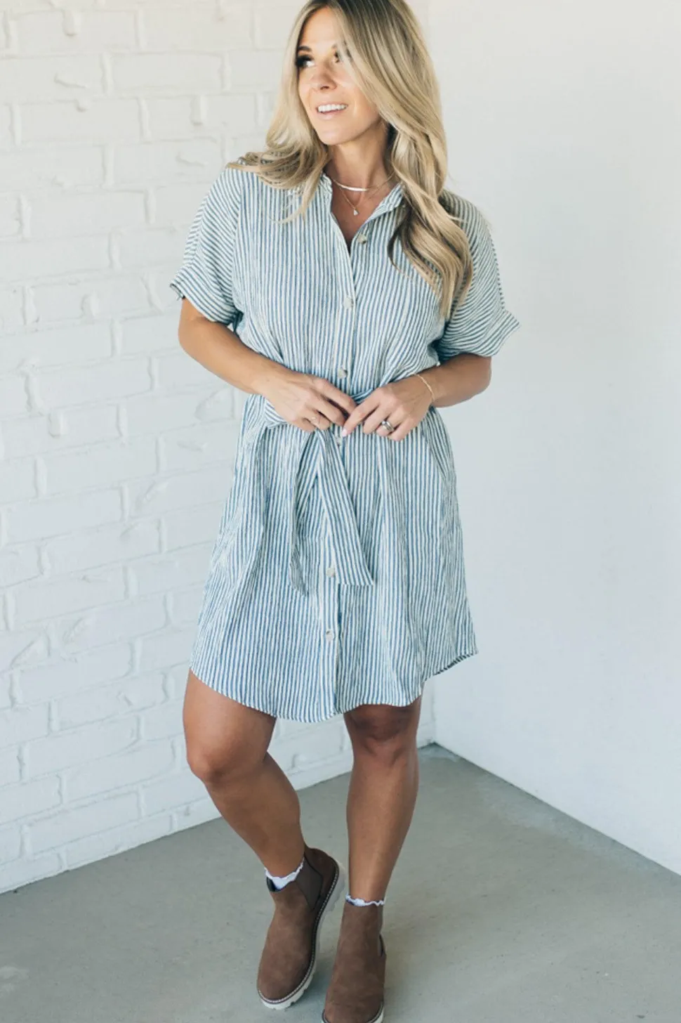 Introducing the Theo Striped Shirt Dress – a playful mix of menswear and feminine charm. Featuring taupe and ivory stripes with a button back half sleeve and removable waist sash for versatile styling. The high low hemline adds a unique touch to this classic shirt dress.