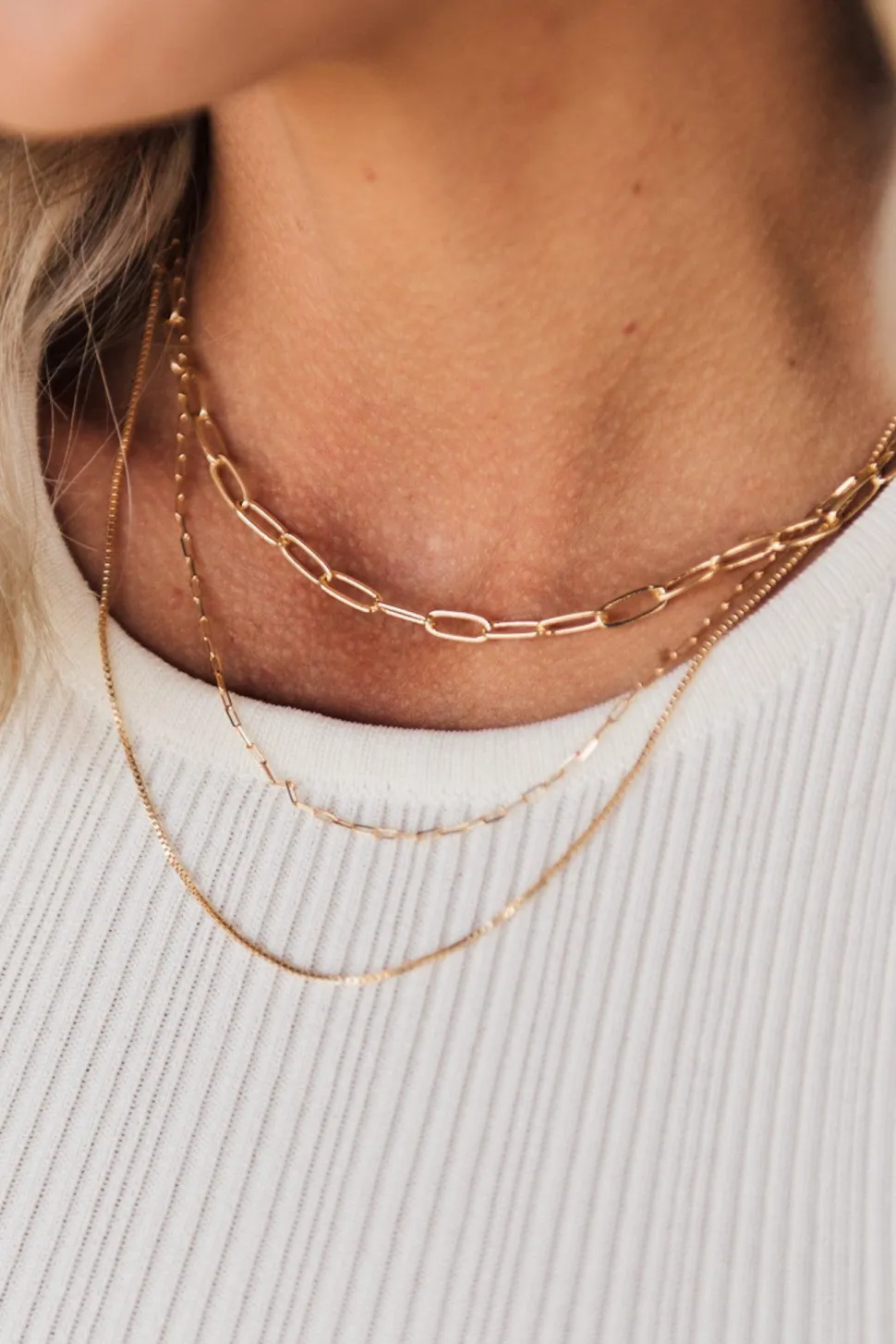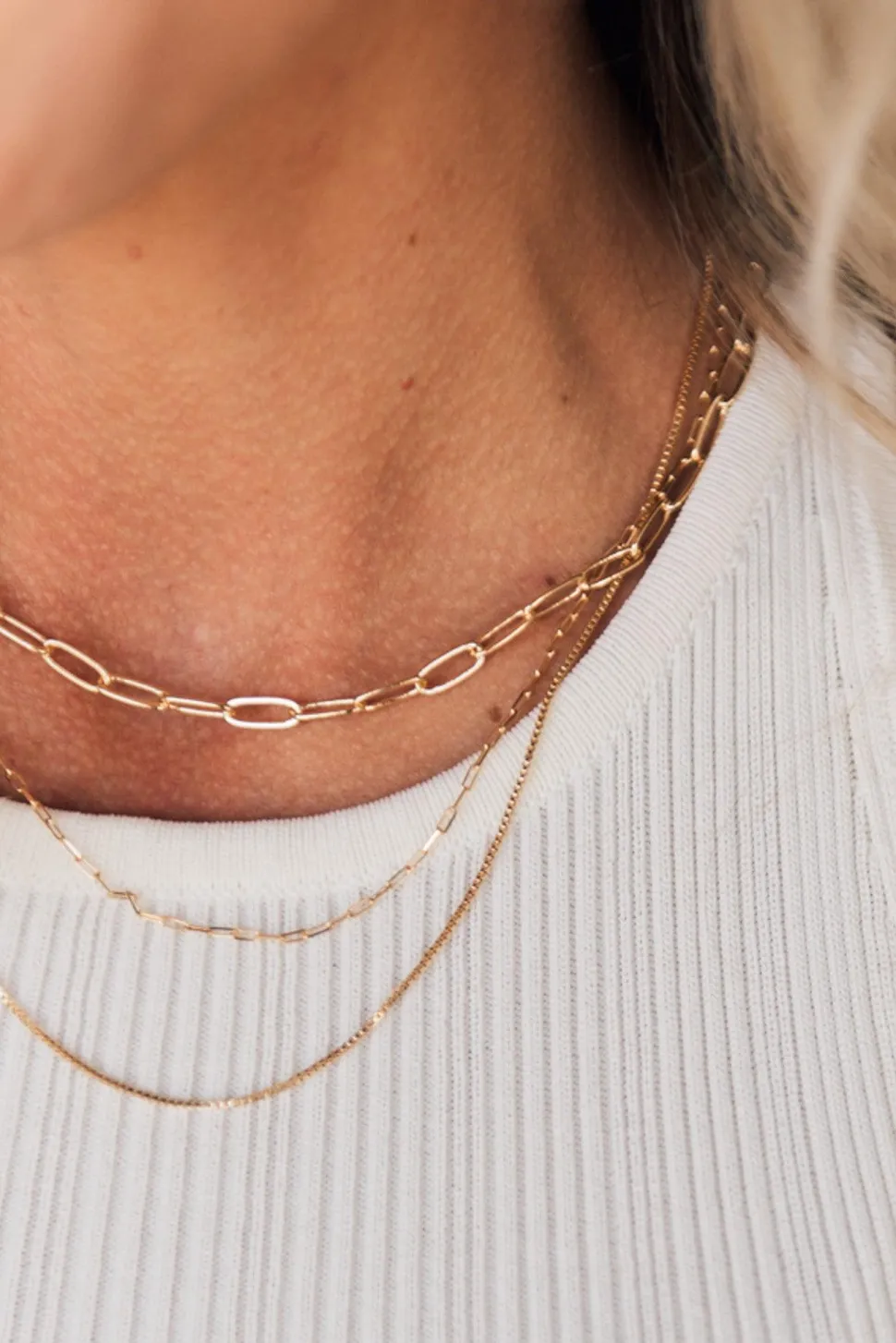 Three rows of chain and delicate links with multi lengths.