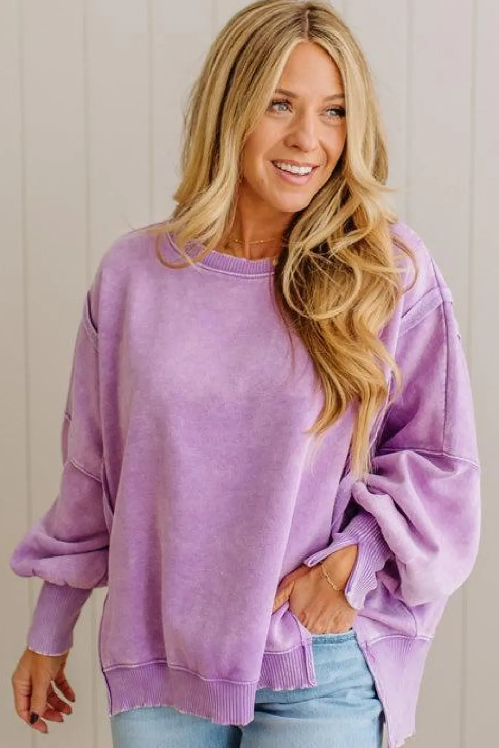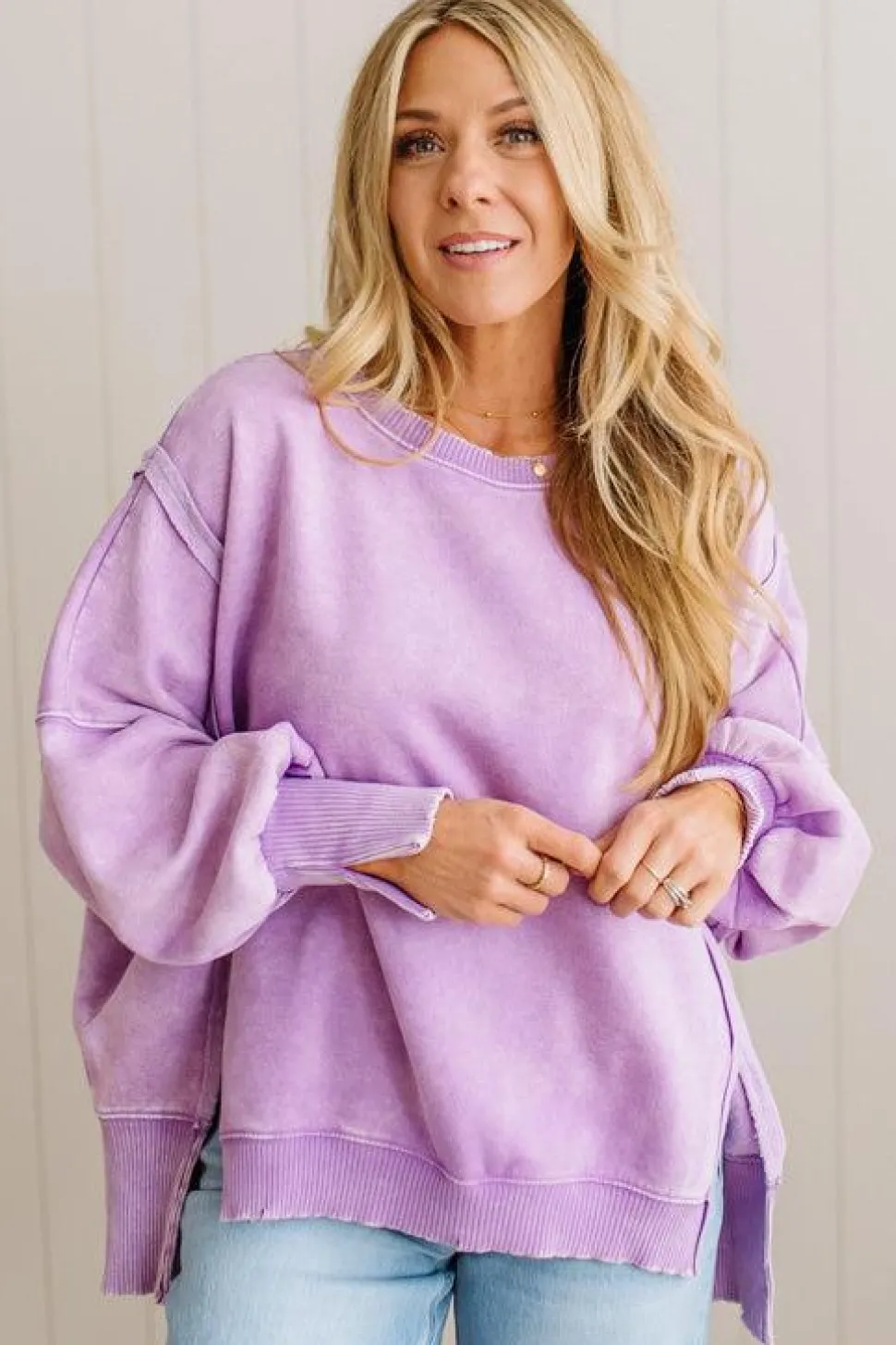 - Self: Acid Wash Batwing High-Low Split Seam Fleece Pullover | 60% Cotton, 40% Polyester