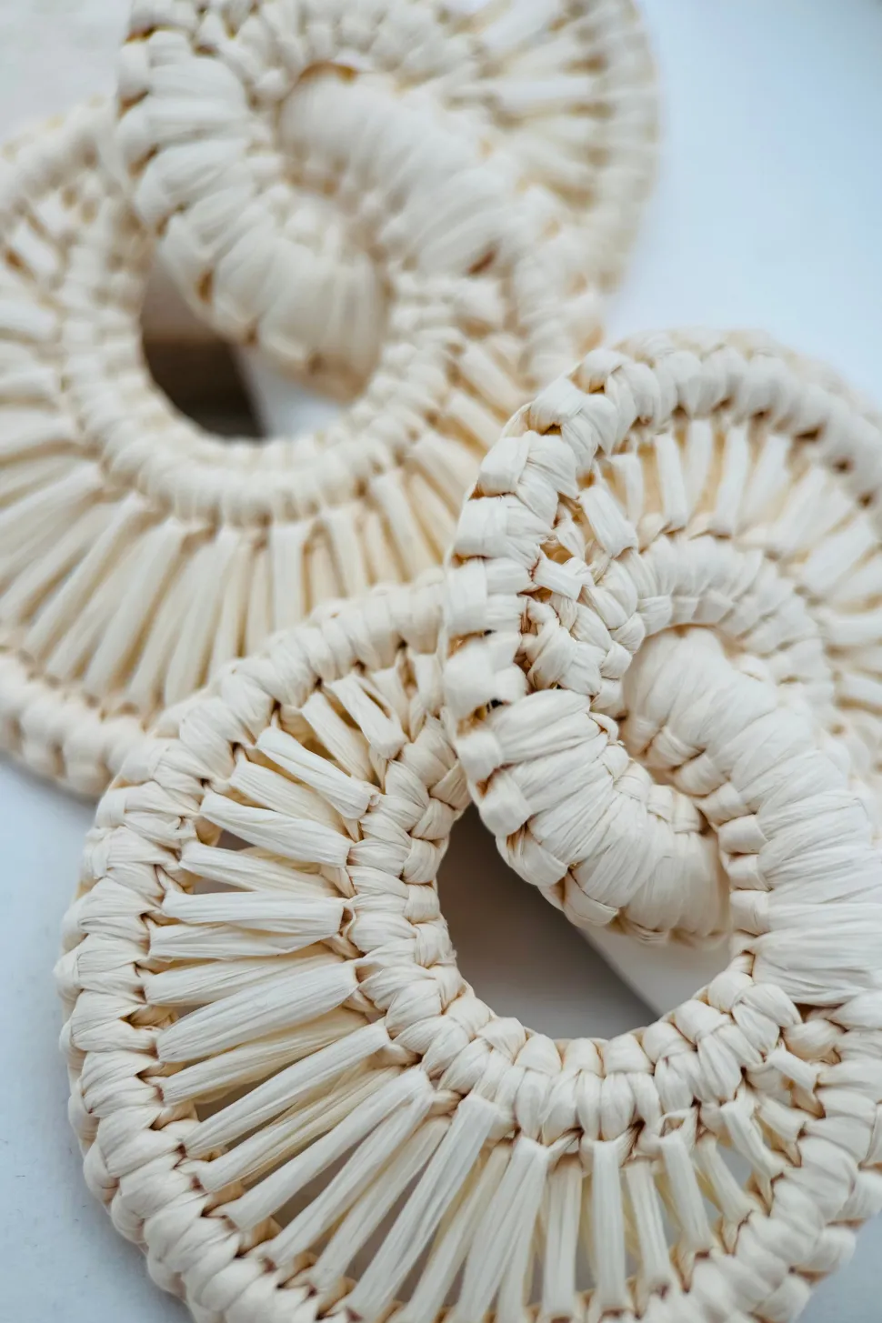 These unique earrings feature double hoops made from woven raffia straw, creating a playful and statement-making look. Perfect for adding a touch of quirkiness to any outfit, these earrings are sure to turn heads and showcase your personality!