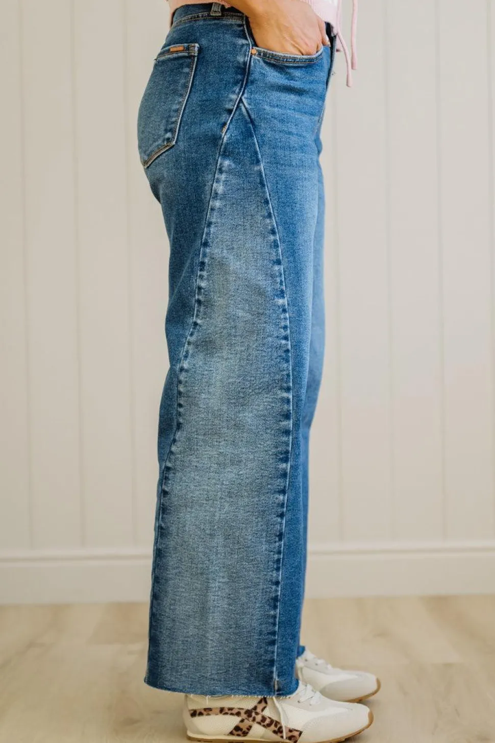 - Contrast denim paneling: Built-in styling—no extra effort required