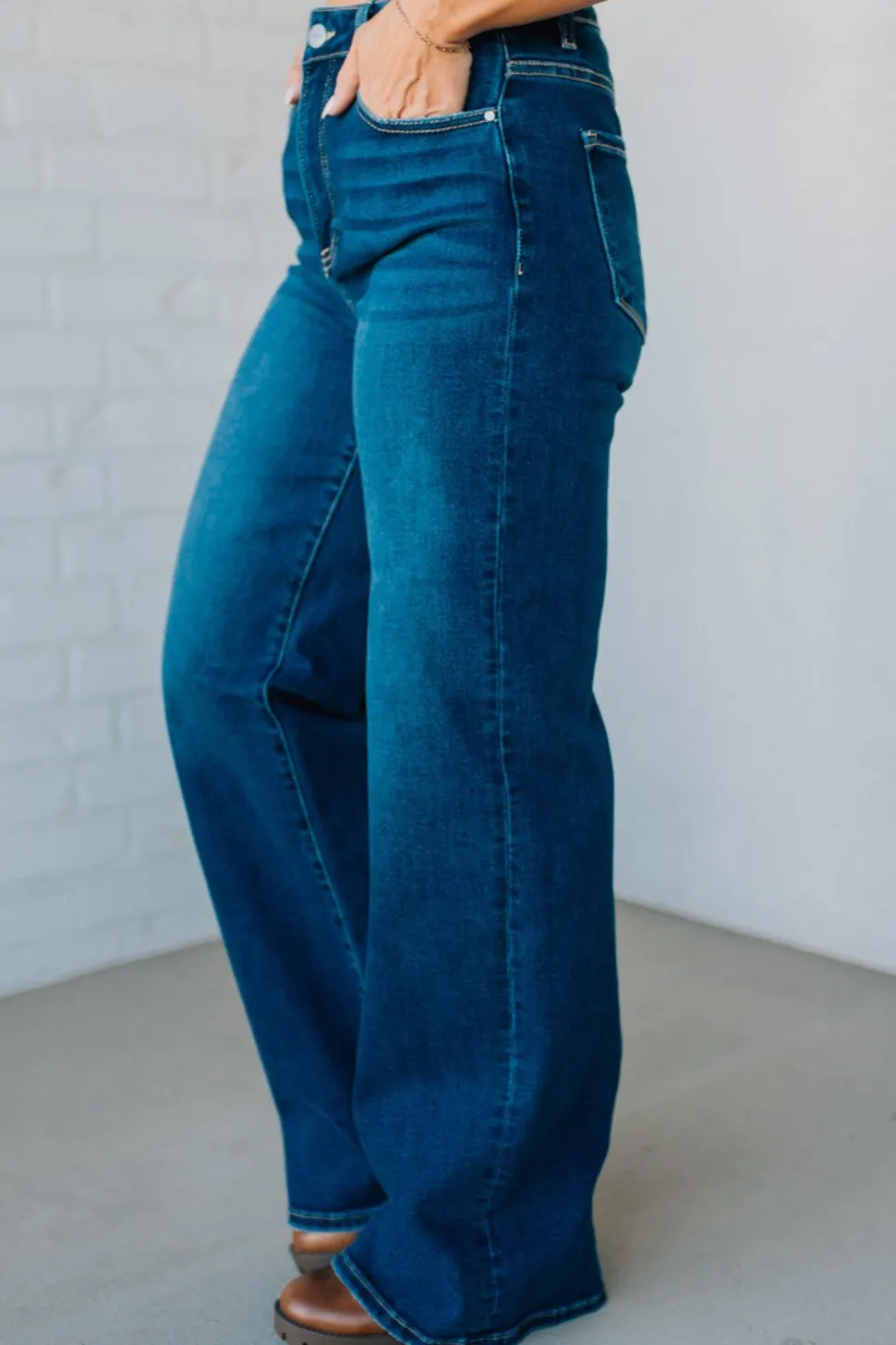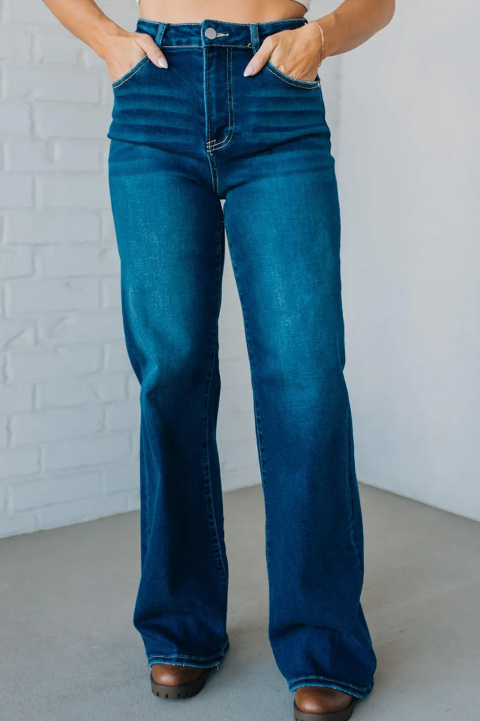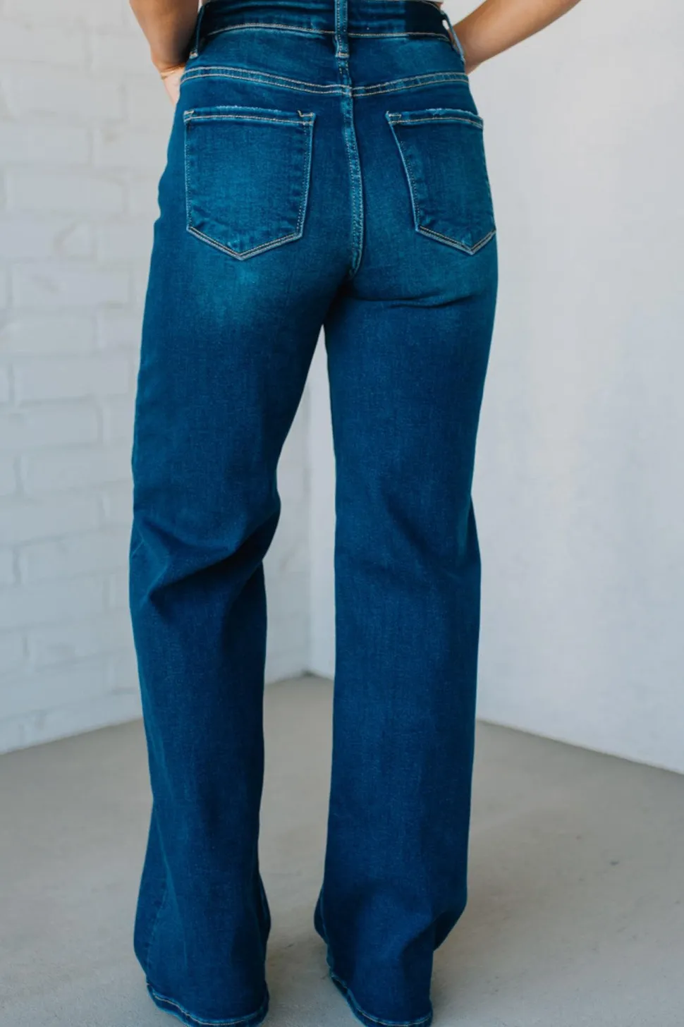 Designed for busy moms and on-trend women who want an easy, polished look from school drop-off to after-work plans – the Alysia High Rise Wide Leg Jeans give you a flattering high rise, a roomy wide flare silhouette, and a dark wash that makes outfits look pulled together with minimal effort.