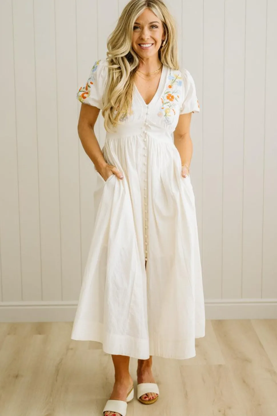 From the whimsical puff sleeves to the vivid hand-embroidered florals climbing across the bodice and sleeves, this dress is made to be seen (and photographed). A partially smocked back and belted waist ensure comfort with shape, while functional buttons and pockets keep things real.