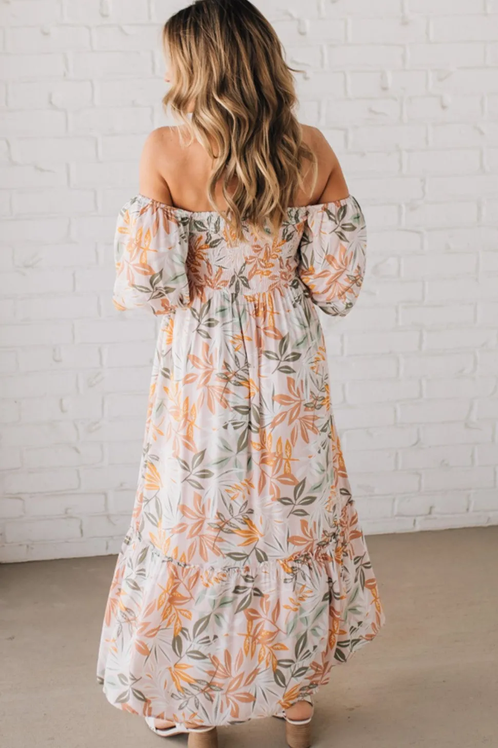 Pretty shades of orange and pink flowers that we are dead over! This pretty dress has a fitted bodice, with a pretty square neckline! The half, puffed sleeves pillow perfectly and stay right in place with the hidden elastic band.